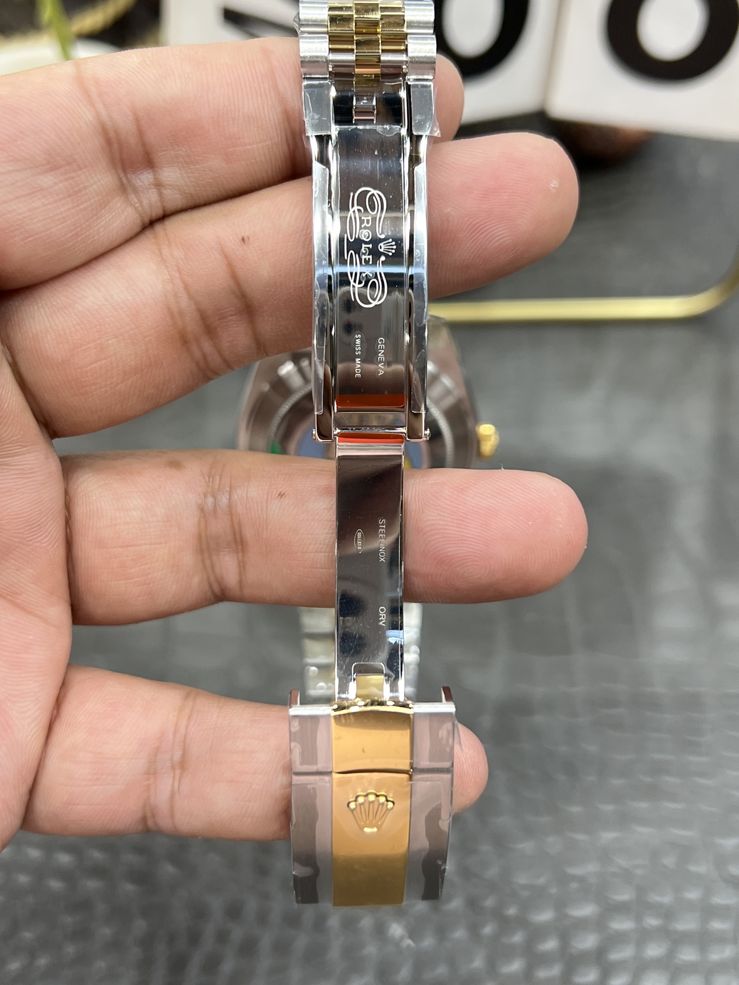 VSファクトリーのゴールドの精度: VSファクトリーは、ロレックス純正の18Kゴールドの正確な色合いをマスターしていることで世界的に高く評価されています。フルーテッドベゼル、リューズ、およびジュビリーの中央リンクには、過度に真鍮のような、または偽物に見える色合いを避けた豊かで温かみのあるイエローゴールドが厚くコーティングされており、手首に信じられないほど裕福で正確な存在感を提供します。