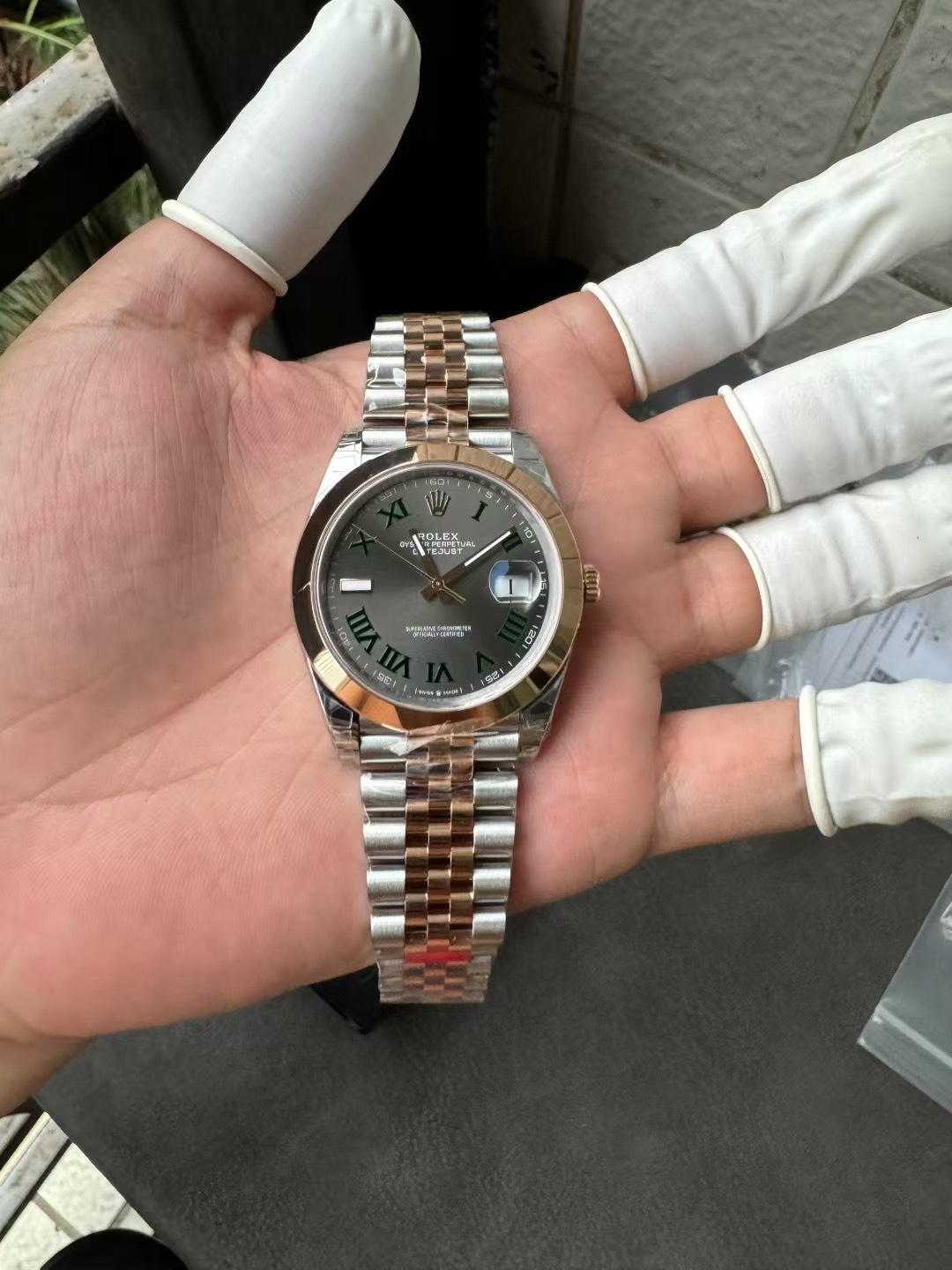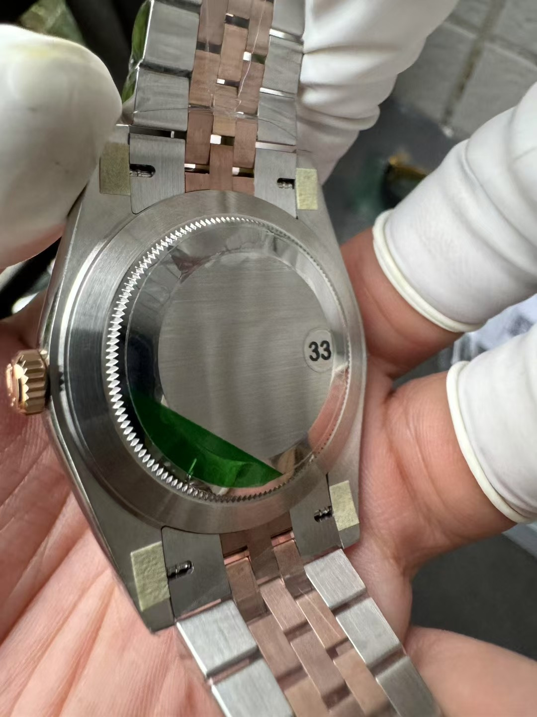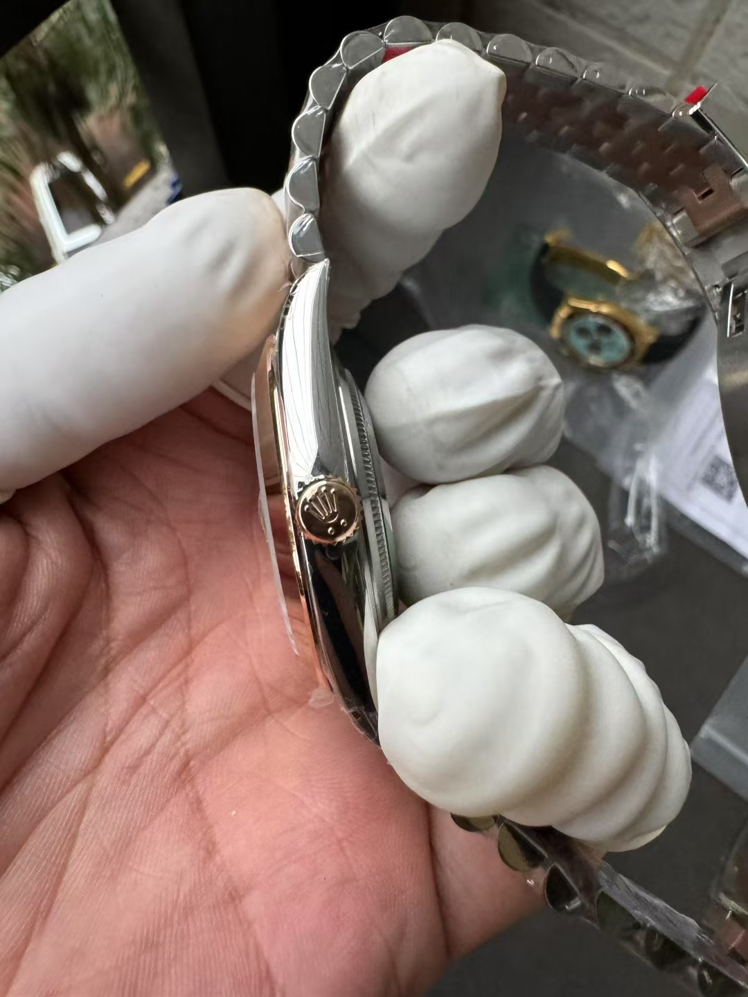 「ツートン ローズゴールド」の美学: ジュビリーブレスレットの外側リンクとメインケースは耐久性に優れた高光沢の904Lオイスタースチールから鍛造されており、スムースドームベゼル、リューズ、および中央リンクには豊かな18Kローズゴールドが厚くコーティングされています。VSFは、過度にピンクがかった、または真鍮のような色合いを避け、ロレックス純正のゴールドに正確に一致するように、この温かく銅色がかった「エバーローズ」の色合いを見事に完成させました。