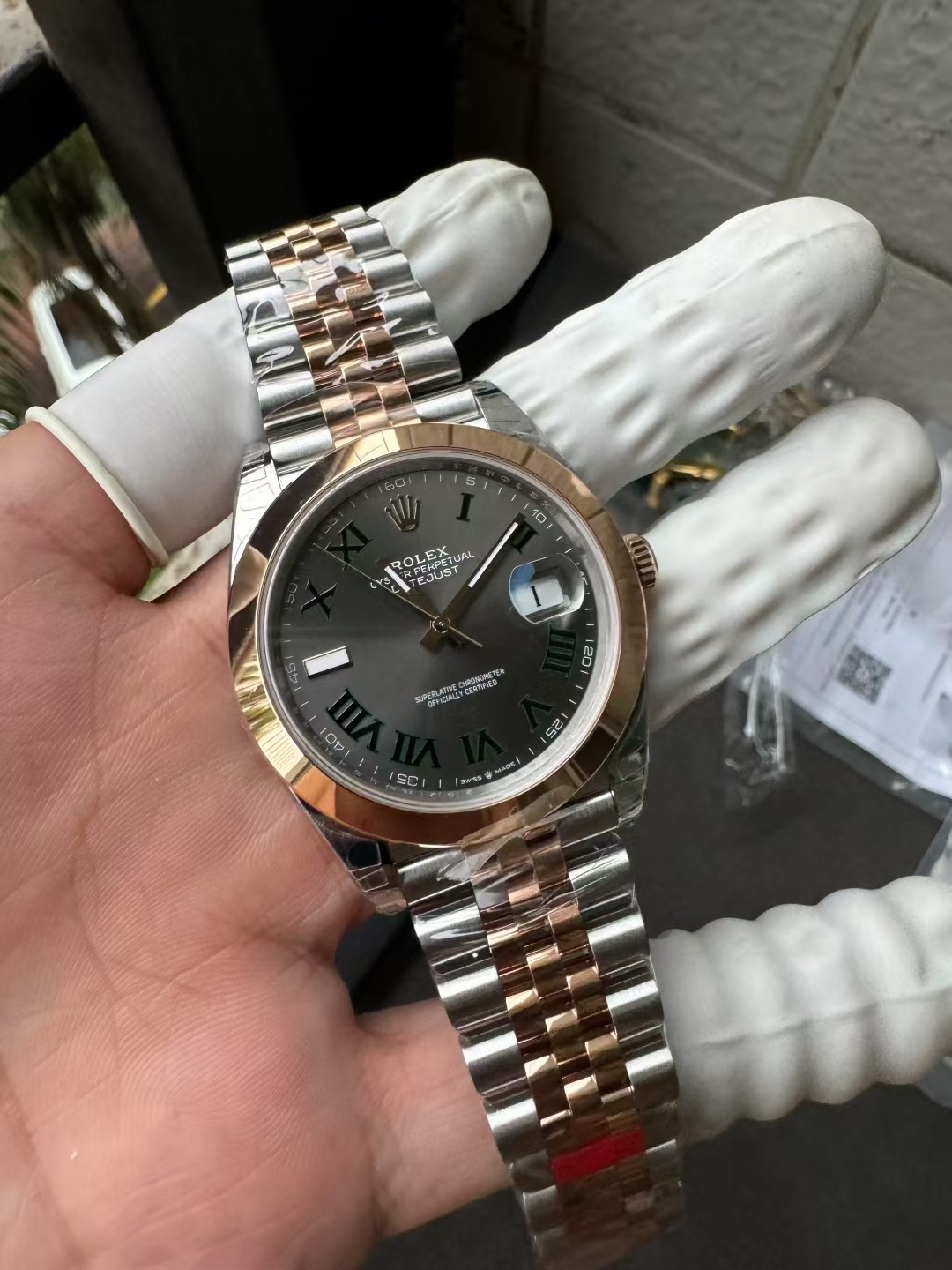 ジュビリーブレスレットを備えたVSファクトリー製のロレックス デイトジャスト 41 (リファレンス 126301) は、スポーツの伝統と洗練された妥協のないラグジュアリーとの息を呑むような融合を表しています。ロレックスのカタログで「エバーローズ ロレゾール」として知られるこのツートン(間金)のローズゴールドの傑作は、904Lステンレススチールケースの頑丈な信頼性と、18Kローズゴールドの豊かでロマンチックな輝きを完璧にブレンドしています。この特定の1:1スーパークローンは、伝説的な「ウィンブルドン」文字盤を、伝統的なフルーテッドベゼルの代わりに高度に研磨されたスムース(ドーム型)ベゼルと組み合わせることで、ユニークでモダンなひねりを提供しています。歴史的にドレッシーなツートン ローズゴールドのジュビリーブレスレットにマウントされ、温かく、魅力的で、非常に特徴的な、完璧にバランスの取れた「スマートカジュアル」な美学を生み出しています。VSFの業界をリードするVS3235自動巻きムーブメントを搭載し、真の72時間パワーリザーブを誇り、妥協のない威信を提供します。