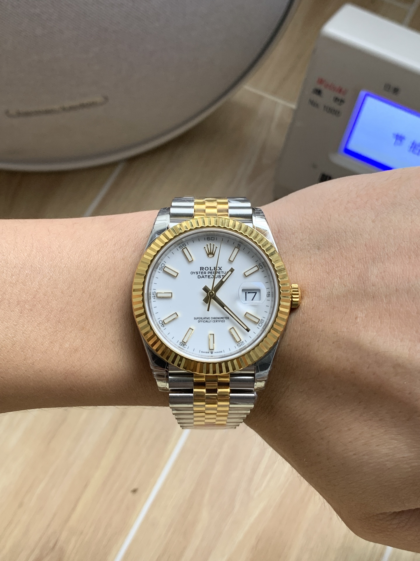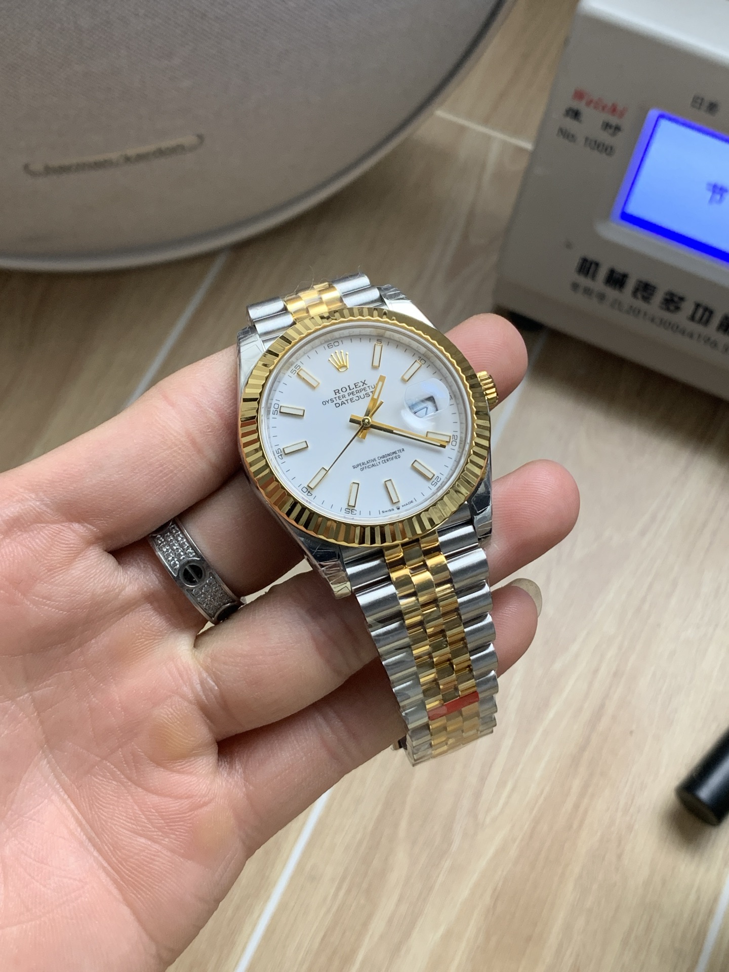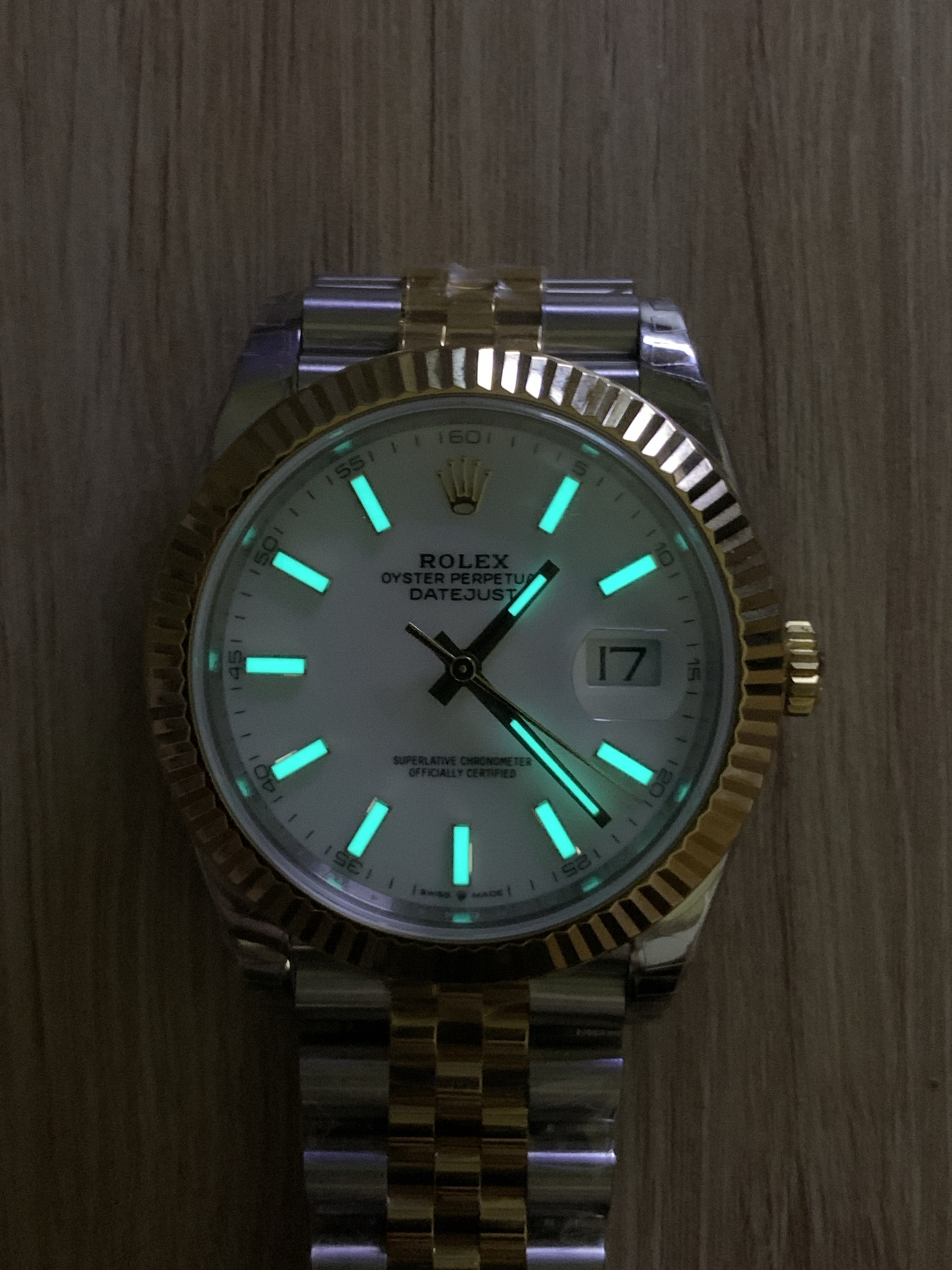 「イエローロレゾール」の美学: ジュビリーブレスレットの外側リンクとメインケースは耐久性に優れた高光沢の904Lオイスタースチールから鍛造されており、ベゼル、リューズ、および中央リンクには豊かな18Kイエローゴールドが厚くコーティングされています。VSFは、過度に真鍮のような、または偽物に見える色合いを避け、ロレックス純正のゴールドに正確に一致するように、この温かみのあるゴールドの色合いを見事に完成させました。