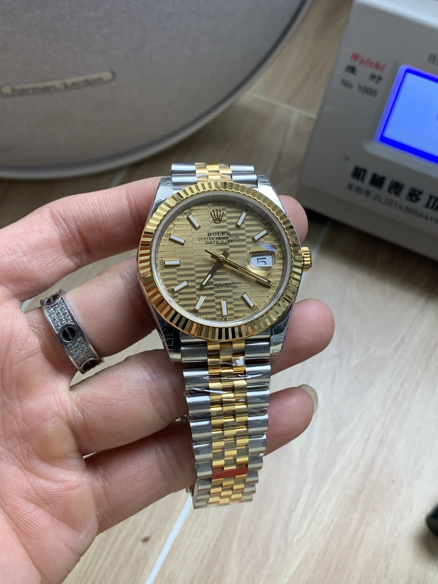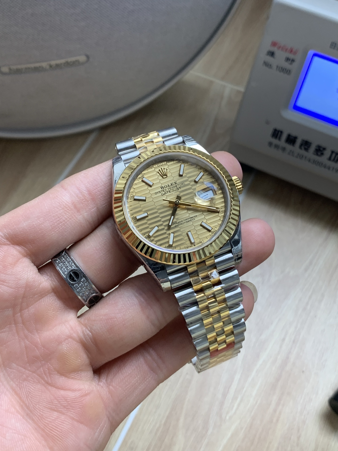 「イエローロレゾール」の美学: この構成は、息を呑むようなハイコントラストのラグジュアリールックを提供します。ジュビリーブレスレットの外側リンクとメインケースは耐久性に優れた高光沢の904Lオイスタースチールから鍛造されており、フルーテッドベゼル、リューズ、および中央リンクには豊かな18Kイエローゴールドが厚くコーティングされています。VSFは、過度に真鍮のような色合いを避け、ロレックス純正のゴールドに正確に一致するように、この温かく豊かな色合いを見事に完成させました。