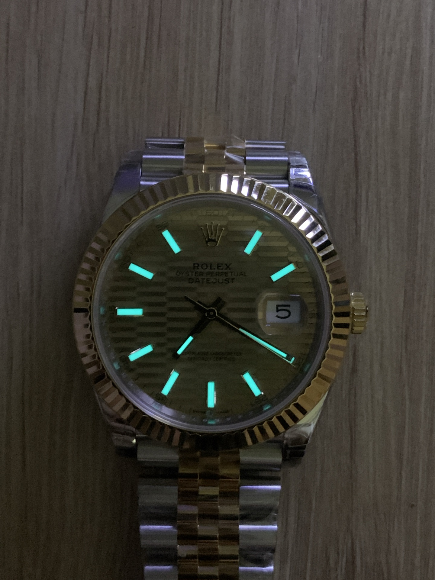 複雑なゴールデン フルーテッドモチーフ文字盤: 文字盤は3Dレーザーエッチング技術の絶対的な傑作です。幾何学模様は、フルーテッドベゼルの光を捉えるファセットを完璧に模倣し、豊かな黄金色のキャンバス全体に息を呑むようなリズミカルなテクスチャーを生み出します。これにより、イエローゴールドの針とアプライド・バトンインデックスに対して信じられないほどの深みとコントラストがもたらされます。インデックスにはプレミアムなクロマライトが充填されており、暗闇で強く長持ちするブルーの輝きを放ちます。