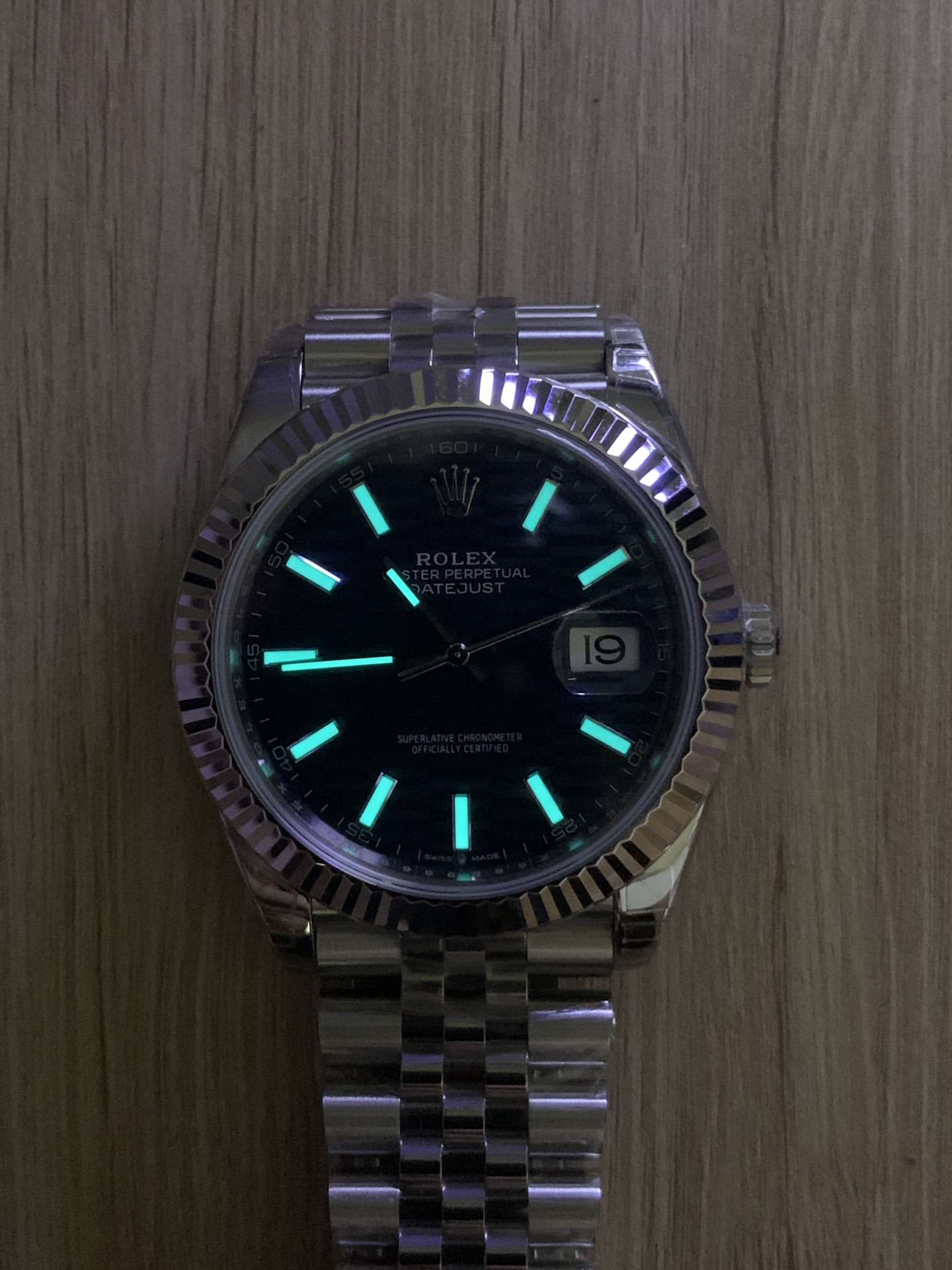 複雑なブルー フルーテッドモチーフ文字盤: 文字盤は、モダンなロレックスのデザインの絶対的な傑作です。3Dレーザーエッチングされた幾何学模様は、豊かで深いブルーの表面全体に息を呑むようなリズミカルなテクスチャーを生み出します。照明に応じて、文字盤は明るくメタリックなネイビーから深くインクのようなミッドナイトブルーへと変化します。アプライド・バトンインデックスは研磨されたスチールで巧みに仕上げられ、プレミアムなクロマライトが充填されており、暗闇で強く長持ちするブルーの輝きを放ちます。