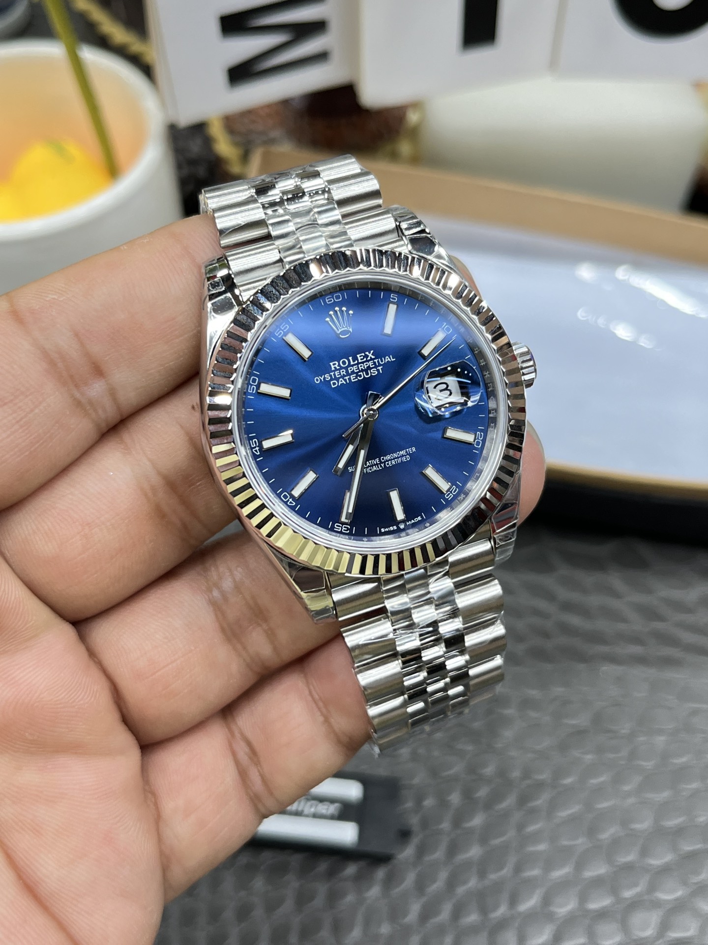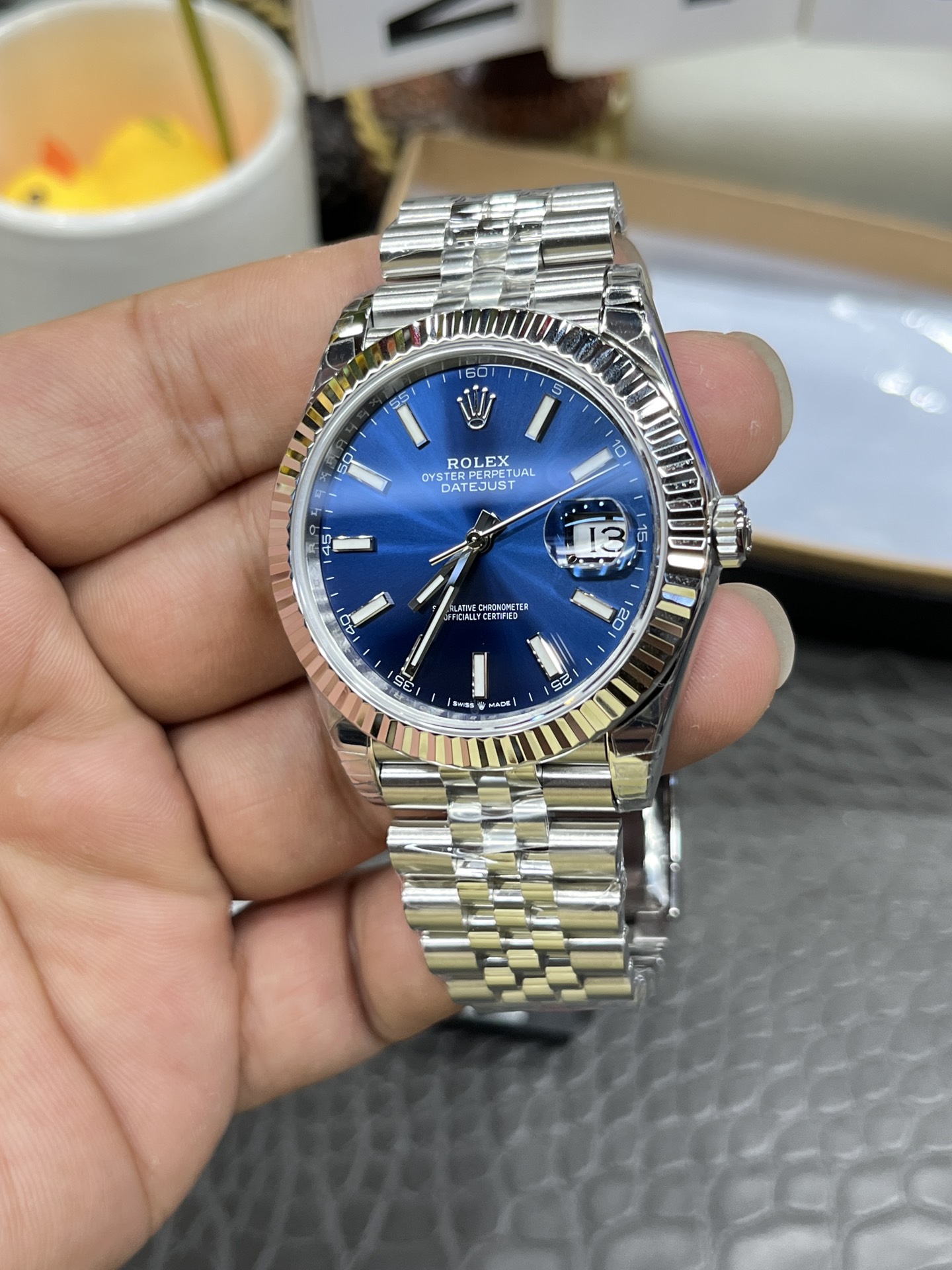象徴的なフルーテッドベゼル: 深くファセット(面)カットされたフルーテッドベゼルはプリズムのように機能し、手首を動かすたびに光を捉えて散乱させます。より大きな41mmのケースでは、このベゼルの表面積が大幅に大きくなり、本物の18Kホワイトゴールドを完全に模倣する豊かで輝かしいきらめきをもたらし、鮮やかなブルーの文字盤の見事なフレームを作成します。