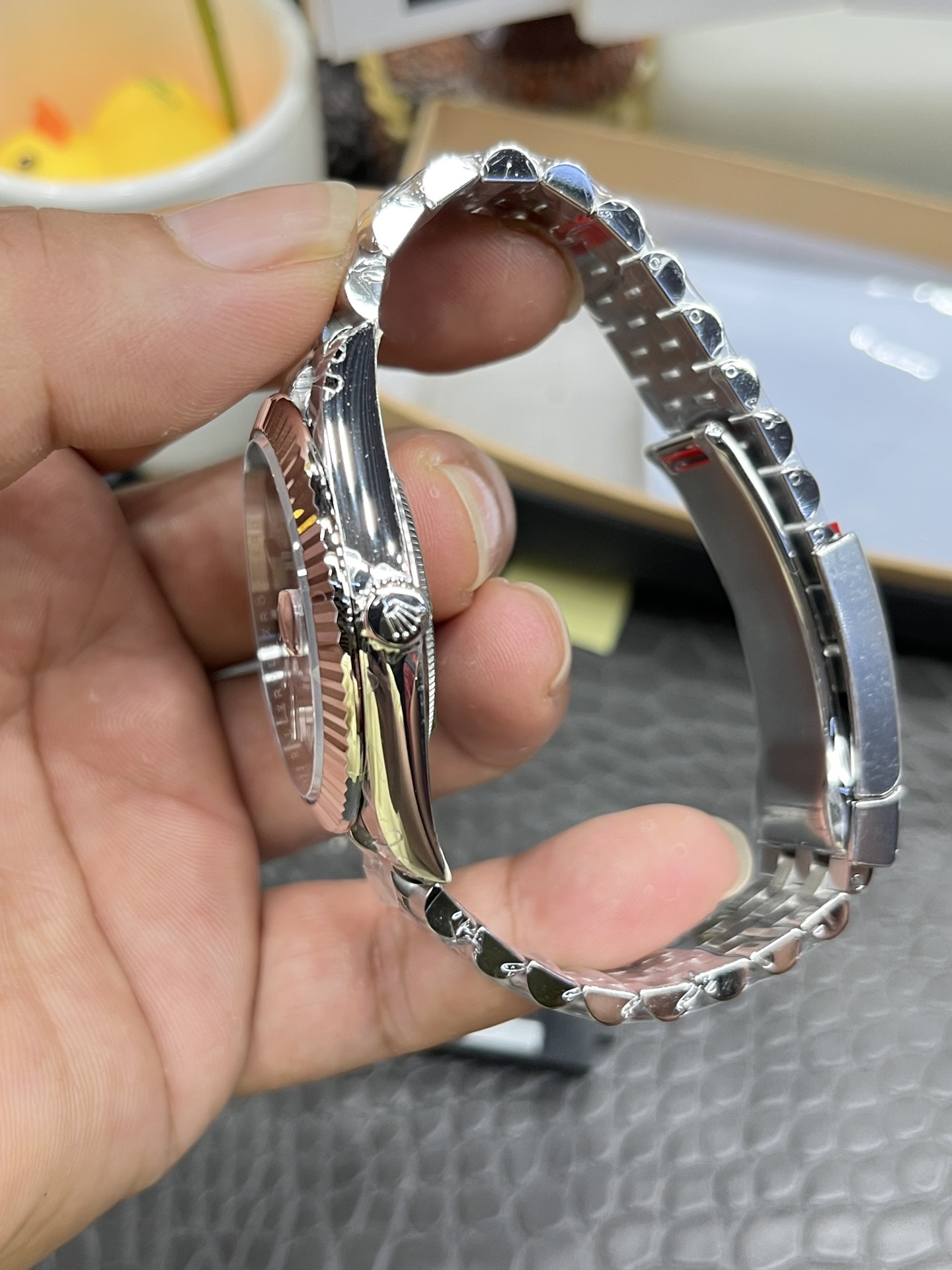 ベゼル: 象徴的なフルーテッドベゼル(ホワイトゴールドを模倣するポリッシュ仕上げ 904Lスチール)