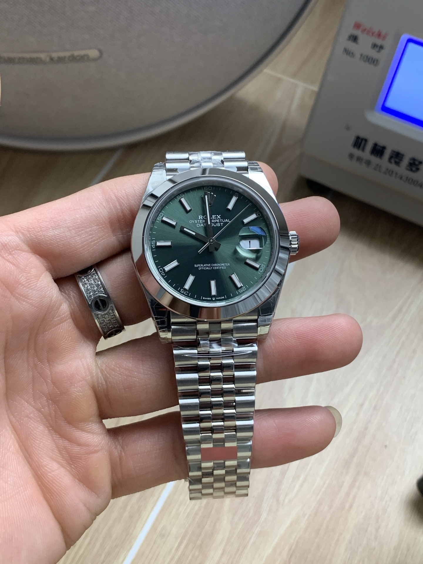 洗練されたスムースベゼルとジュビリーのコンボ: ここが、この時計が非常に用途の広い個性を獲得するところです。伝統的なファセット(面)カットされたフルーテッドベゼルを高度に研磨された滑らかなスチールドームに置き換えることで、見事なグリーンの文字盤がきらめきを競うことなく主役になることができます。歴史的にドレッシーで光を捉えるジュビリーブレスレットと見事に組み合わさり、完璧にバランスの取れた美学を生み出しています。