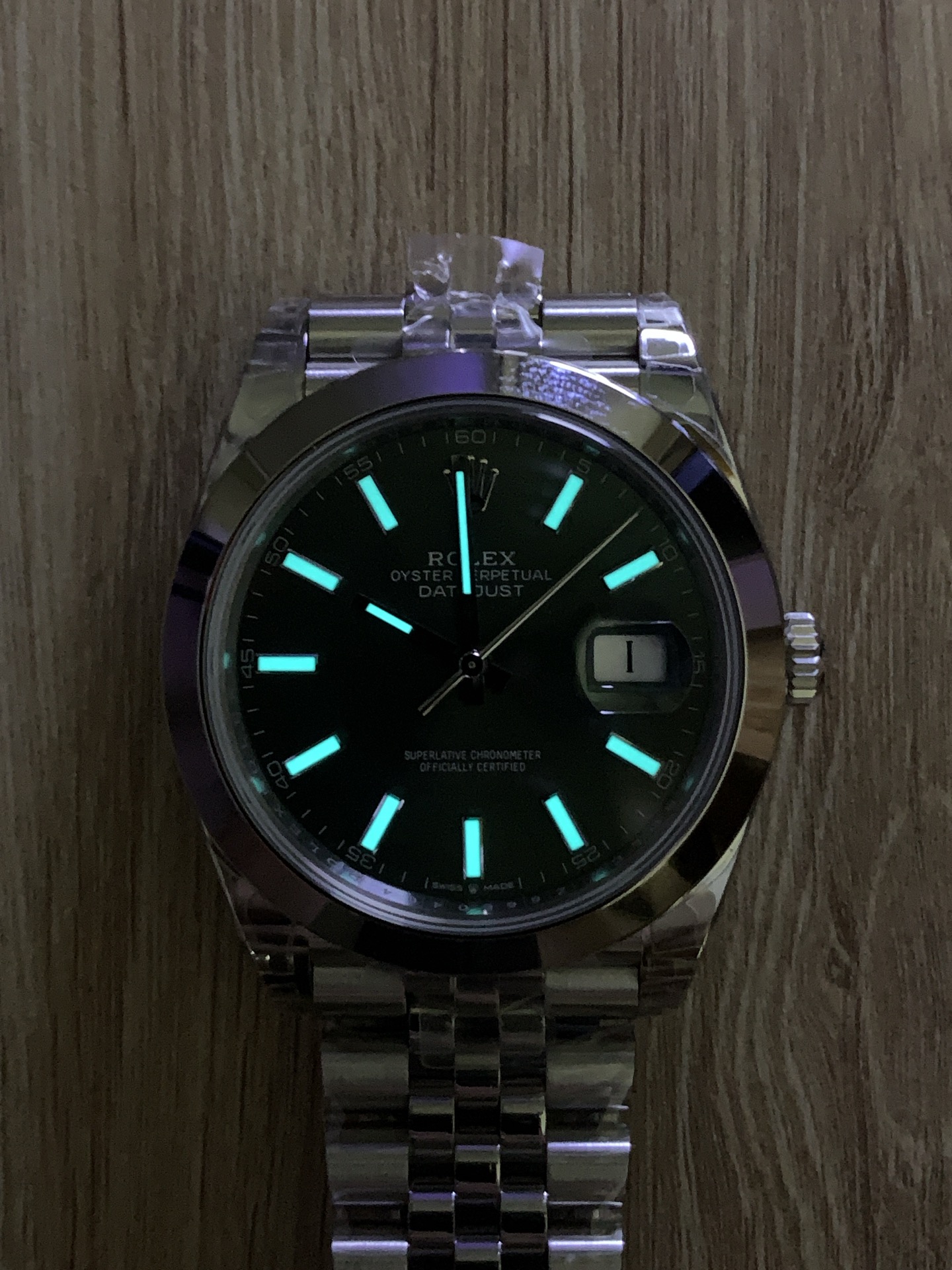トレンドのミントグリーン サンバースト文字盤: 文字盤は繊細でモダンな色彩の絶対的な傑作です。非常に人気のあるミントグリーンのフェイスは、光を美しく捉える鮮やかなサンバーストテクスチャーを特徴としており、角度によって柔らかく銀色がかったオリーブから、より豊かで鮮やかなグリーンへと変化します。アプライド・バトンインデックスは研磨されたスチールで巧みに仕上げられ、プレミアムなクロマライトが充填されており、暗い状況で強く長持ちするブルーの輝きを放ちます。