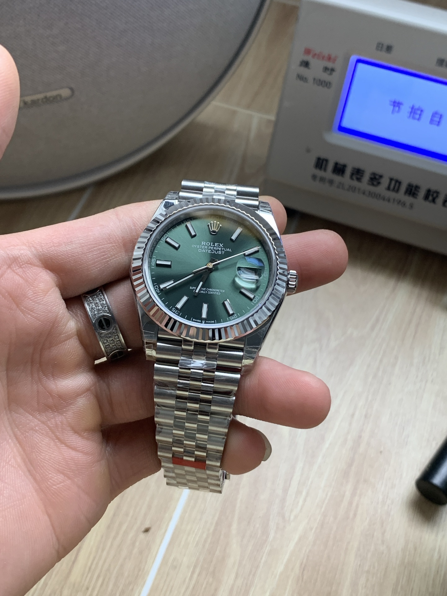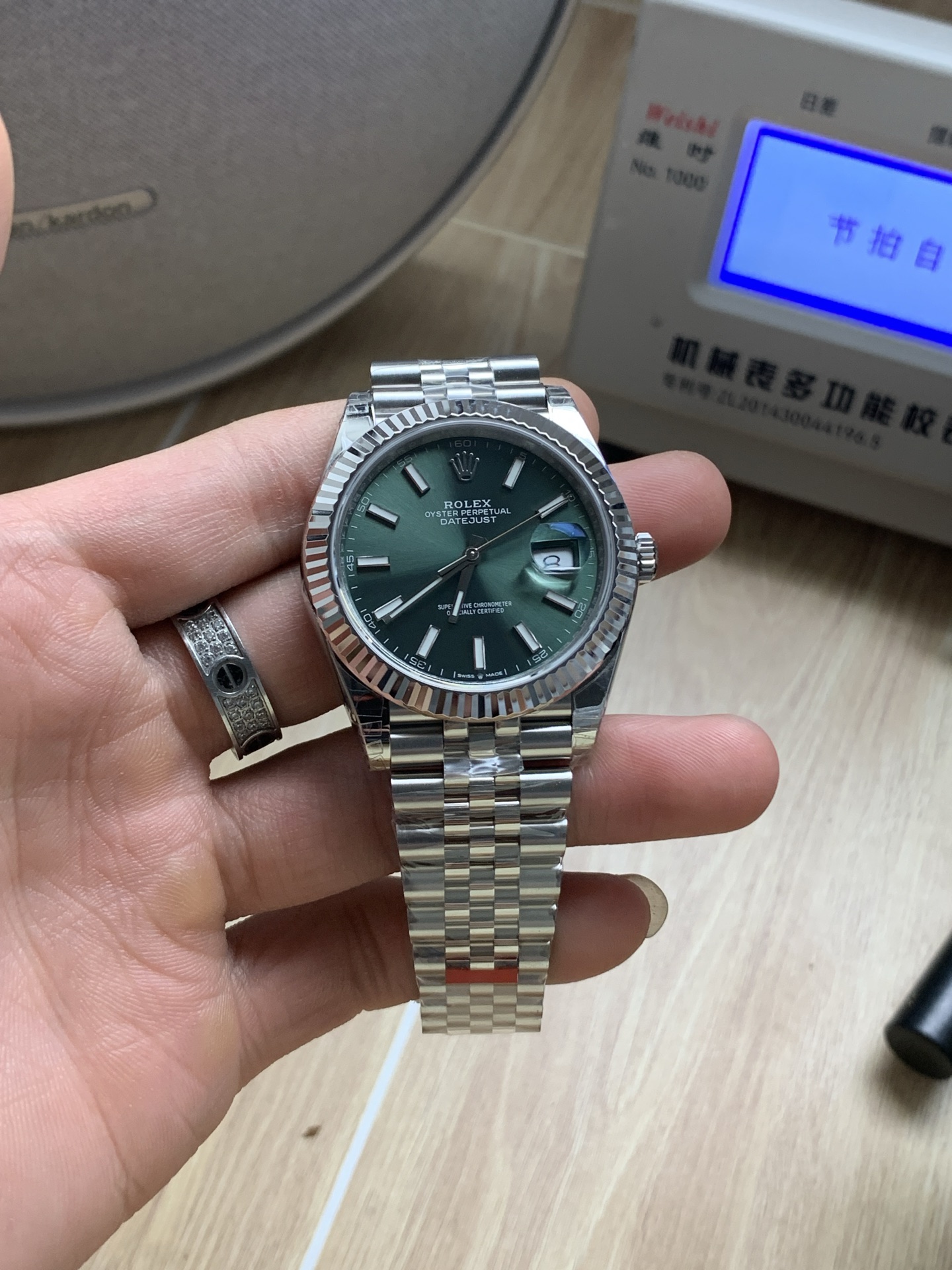 • トレンドのミントグリーン サンバースト文字盤: 文字盤は、モダンな色彩表現の絶対的な傑作です。非常に切望されているミントグリーンのフェイスは、光を美しく捉える鮮やかなサンバーストテクスチャーを特徴としており、角度によって柔らかく銀色がかったオリーブから、より豊かで鮮やかなグリーンへと変化します。アプライド・バトンインデックスは研磨されたスチールで巧みに仕上げられ、プレミアムなクロマライトが充填されており、暗い状況で強く長持ちするブルーの輝きを放ちます。