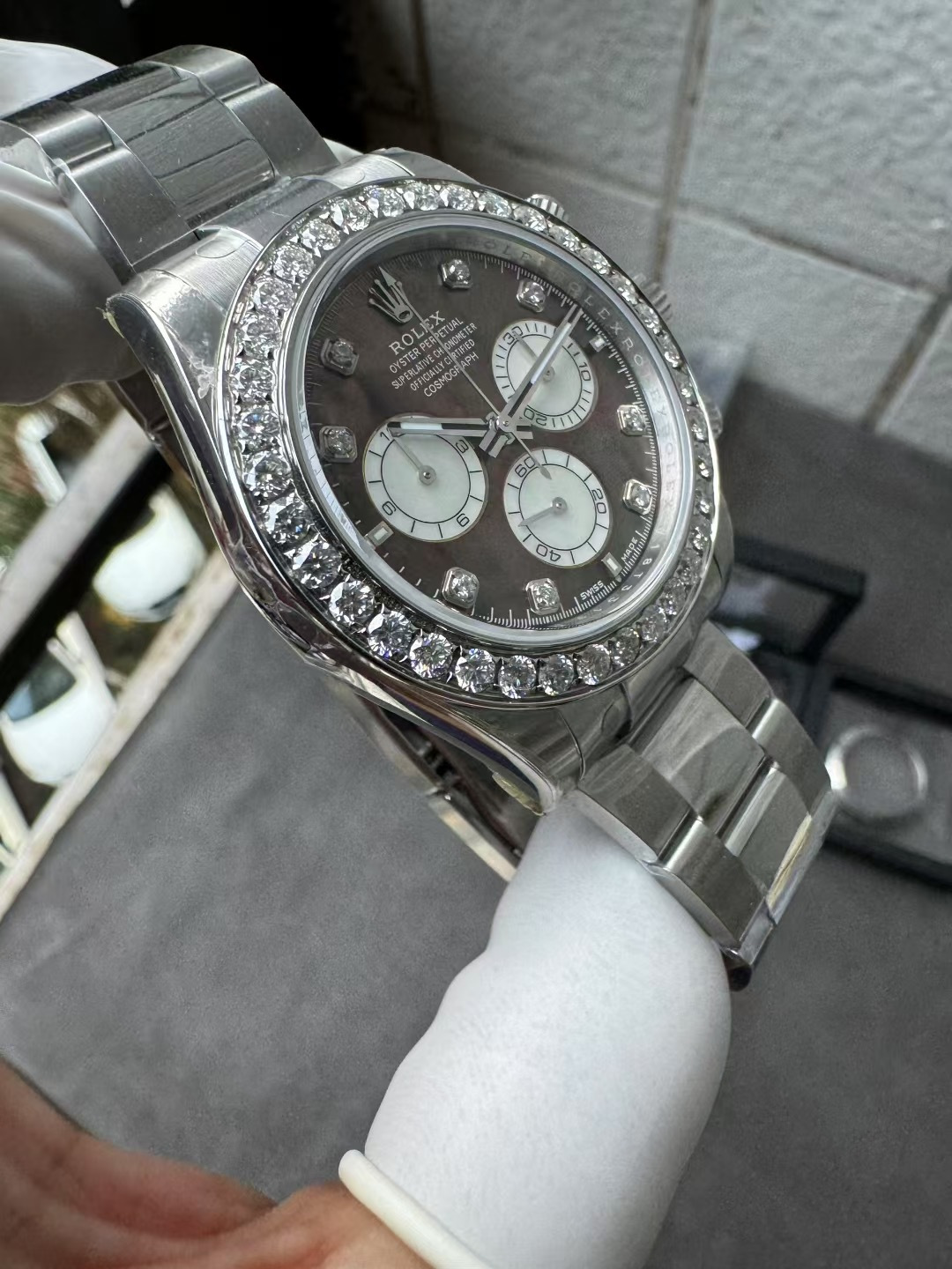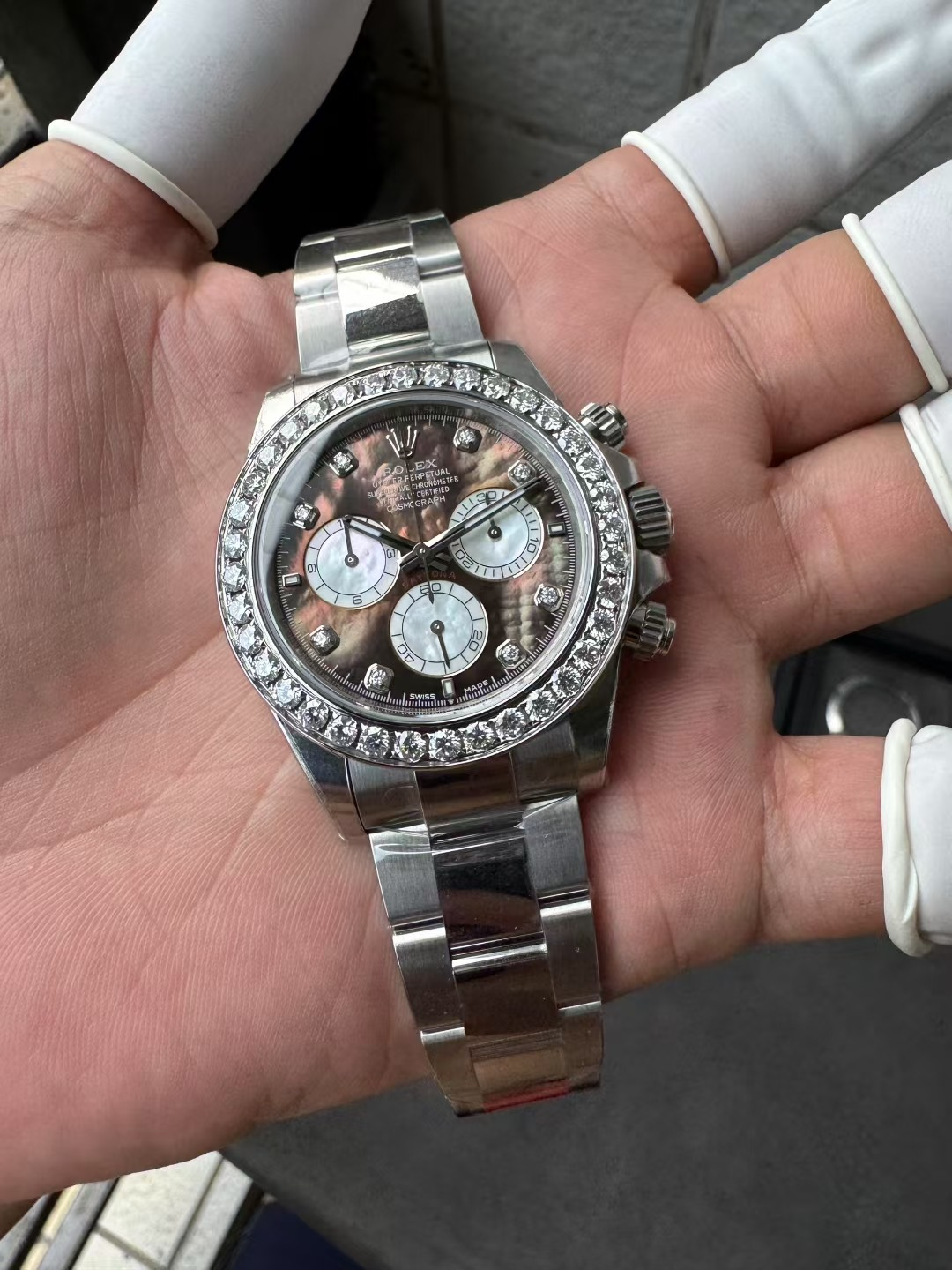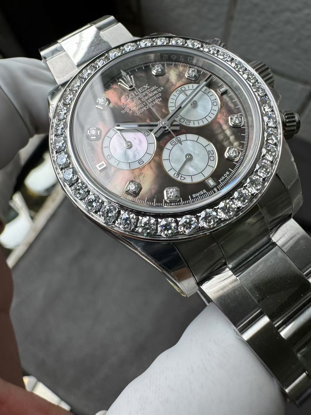 モデルスタイル: カスタム ジェムセット コスモグラフ デイトナ(ダイヤモンド ベゼル / ブラック MOP文字盤 / ダイヤモンド マーカー)