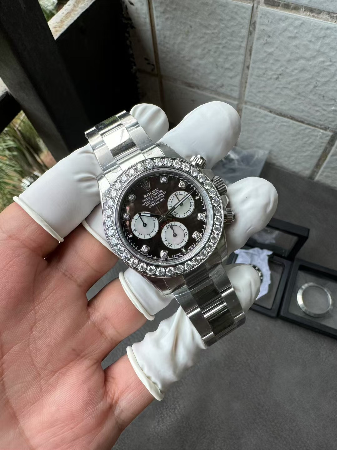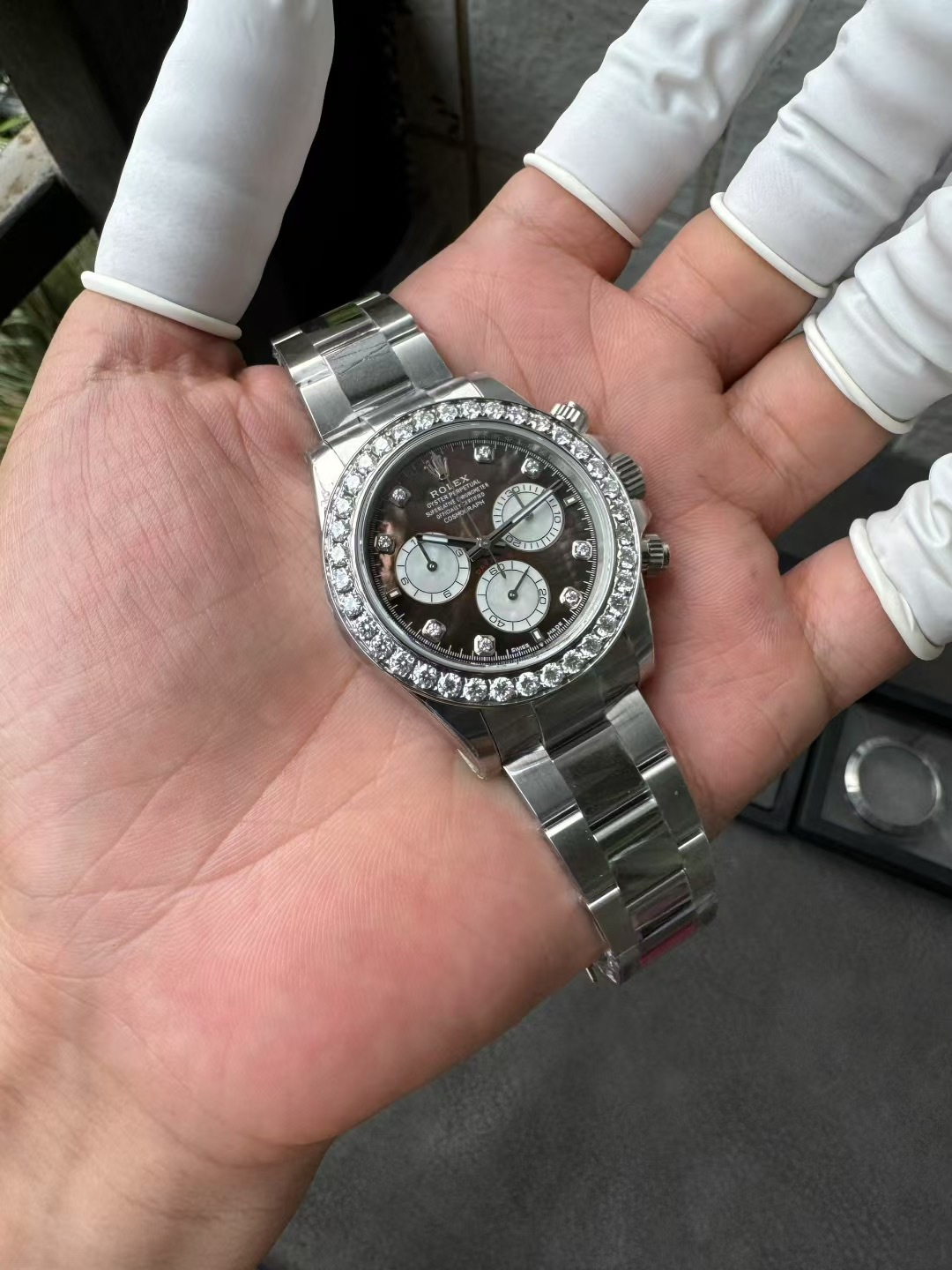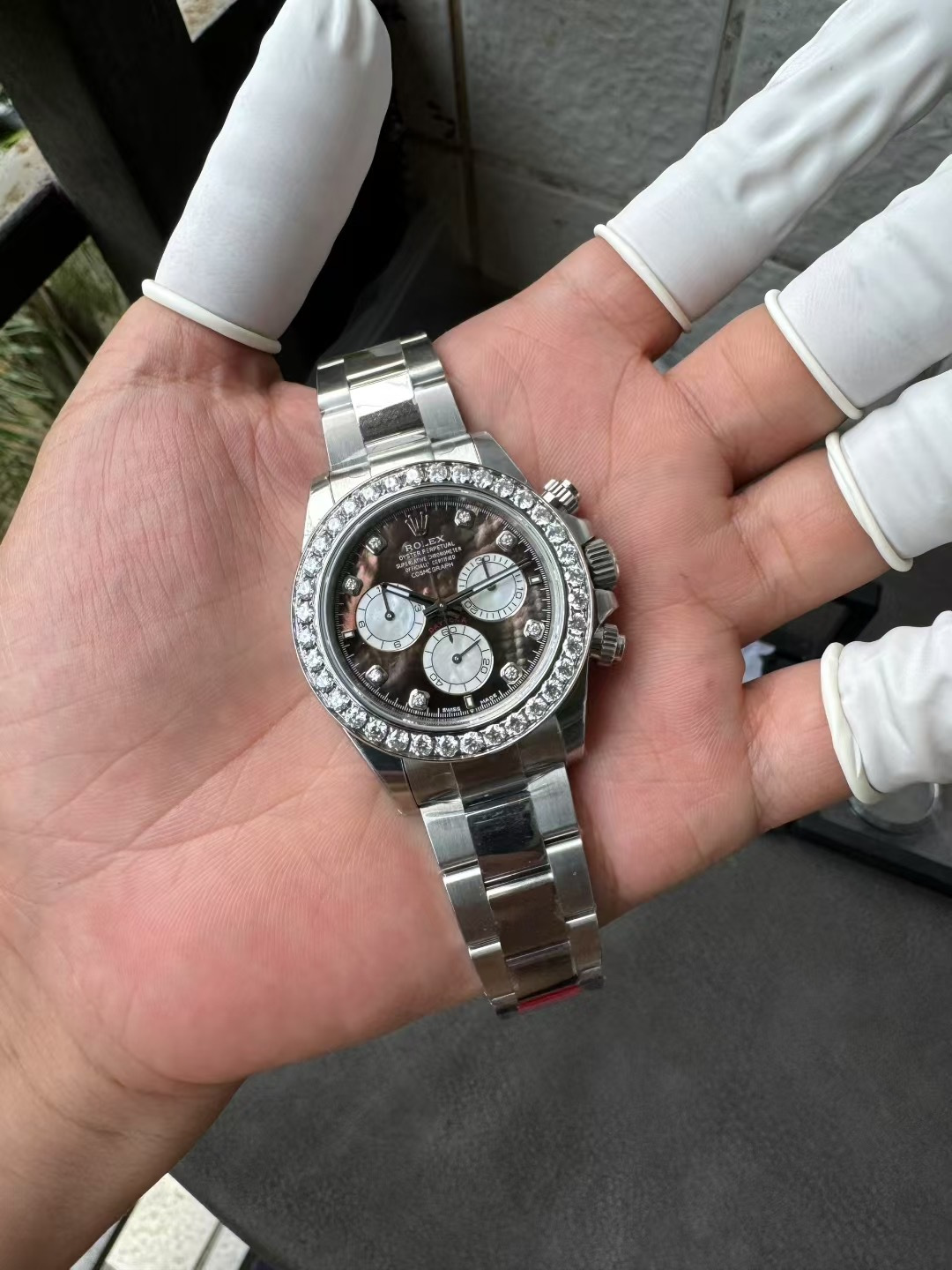 モデルスタイル: カスタム ジェムセット コスモグラフ デイトナ(ダイヤモンド ベゼル / ブラック MOP文字盤 / ダイヤモンド マーカー)