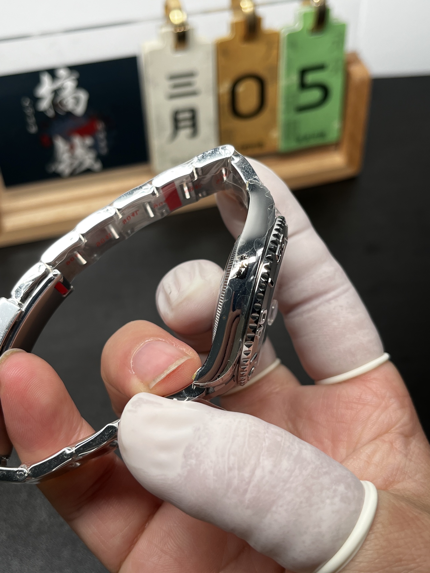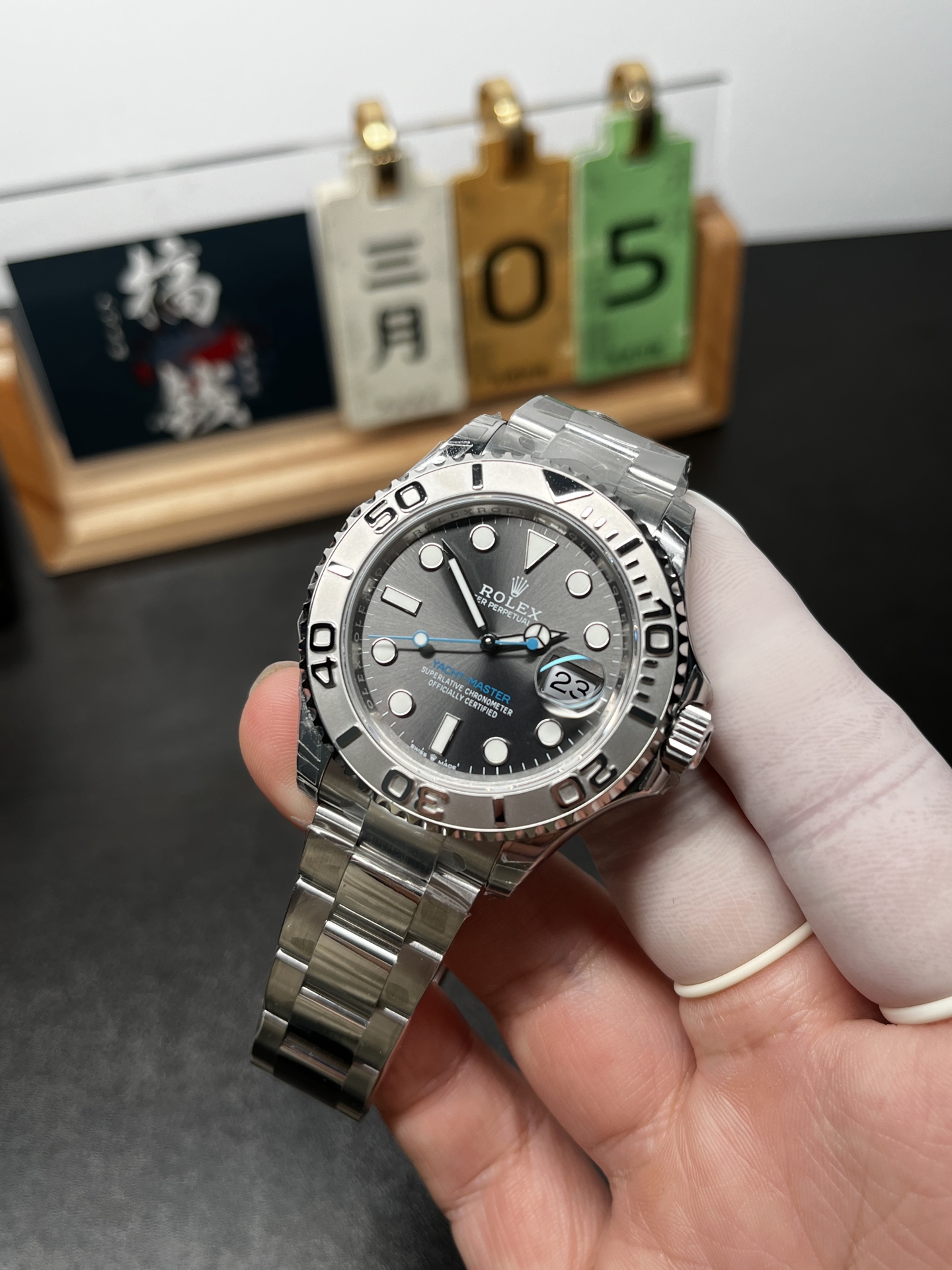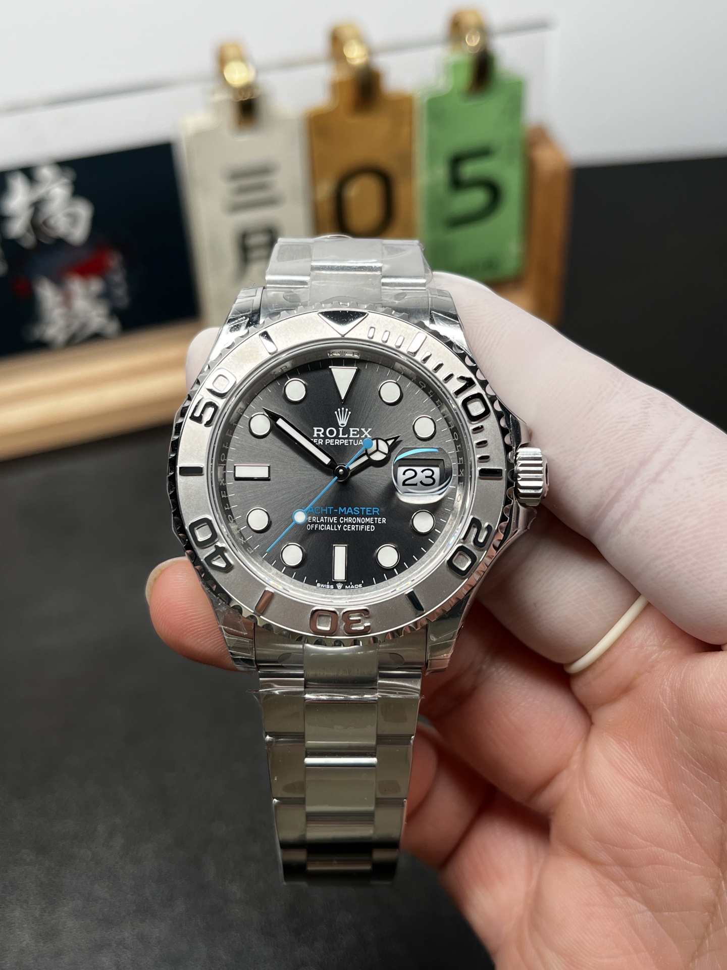 象徴的な「ロレジウム」レリーフベゼル: 両方向回転ベゼルは、スチール製ヨットマスターの決定的な特徴です。VSFは、豪華なプラチナの美学を完璧に複製しました。背景はステルスなフロスト/サンドブラスト仕上げを特徴としており、立体的な60分の目盛りと数字は鏡面仕上げに高度に研磨され、部屋の反対側からでも目を引く見事な3D効果を生み出します。