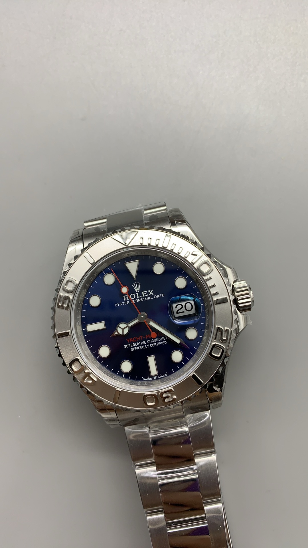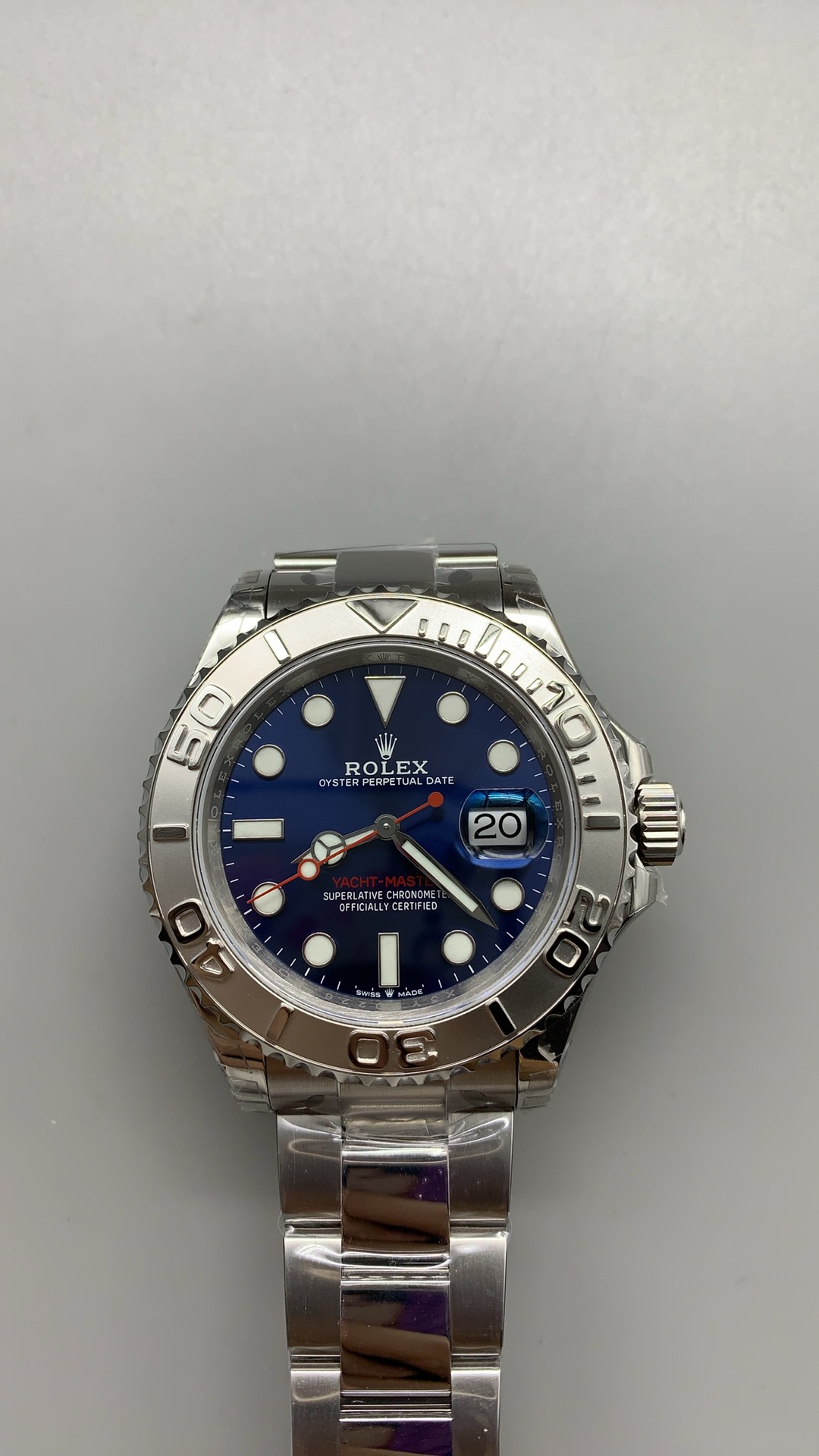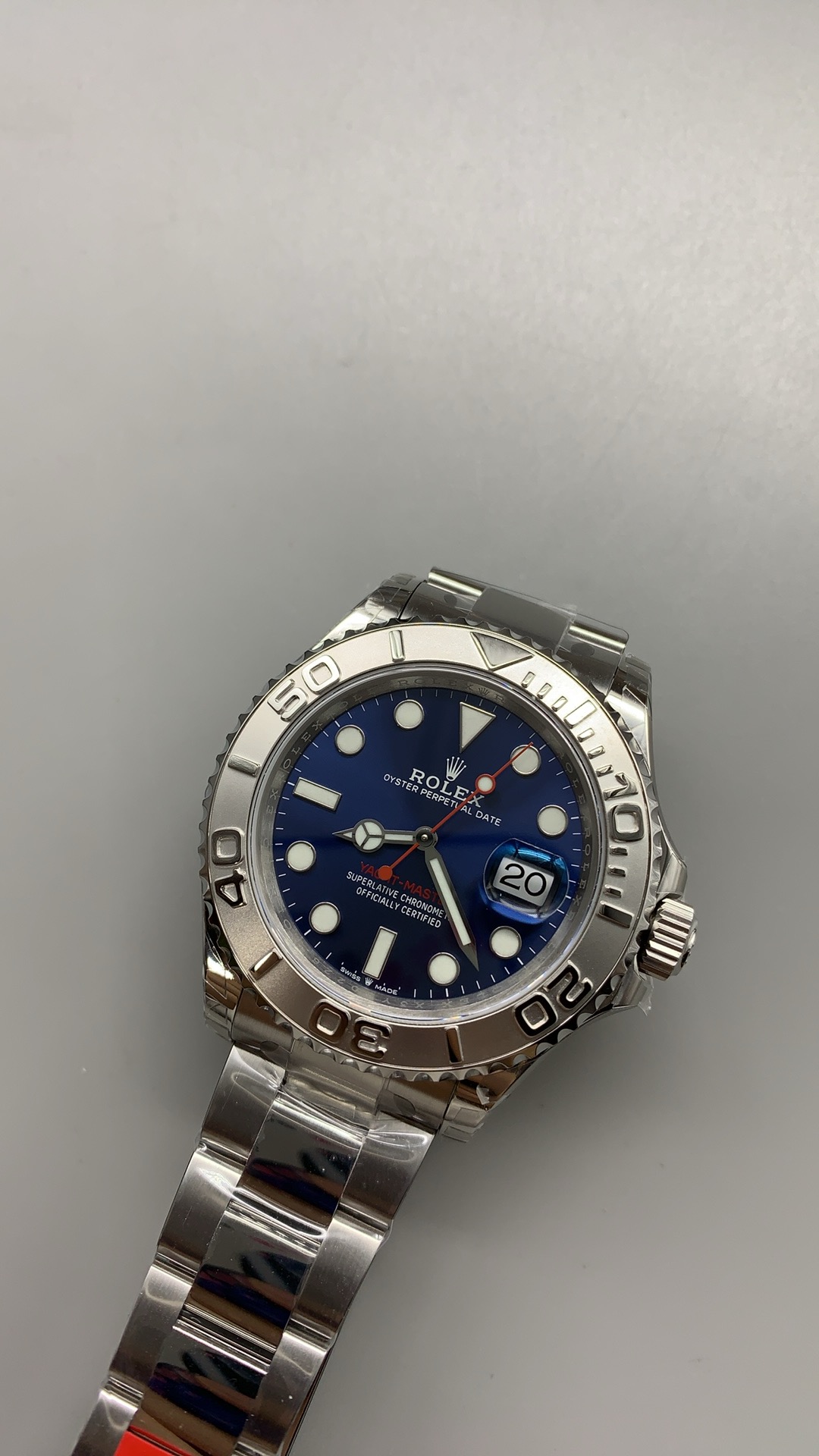 鮮やかなブルー サンバースト文字盤: 文字盤はダイナミックな色彩の傑作です。深く海のようなブルーのフェイスは、照明に応じて明るいコバルトから深いネイビーへと劇的に変化する鮮やかなサンバーストテクスチャーを特徴としています。この特定の文字盤にアグレッシブでスポーティな個性を与えているのは、ハイコントラストな鮮やかな赤の秒針とマッチする「YACHT-MASTER」のテキストであり、ロレックスのモータースポーツとセーリングの伝統に直接オマージュを捧げています。