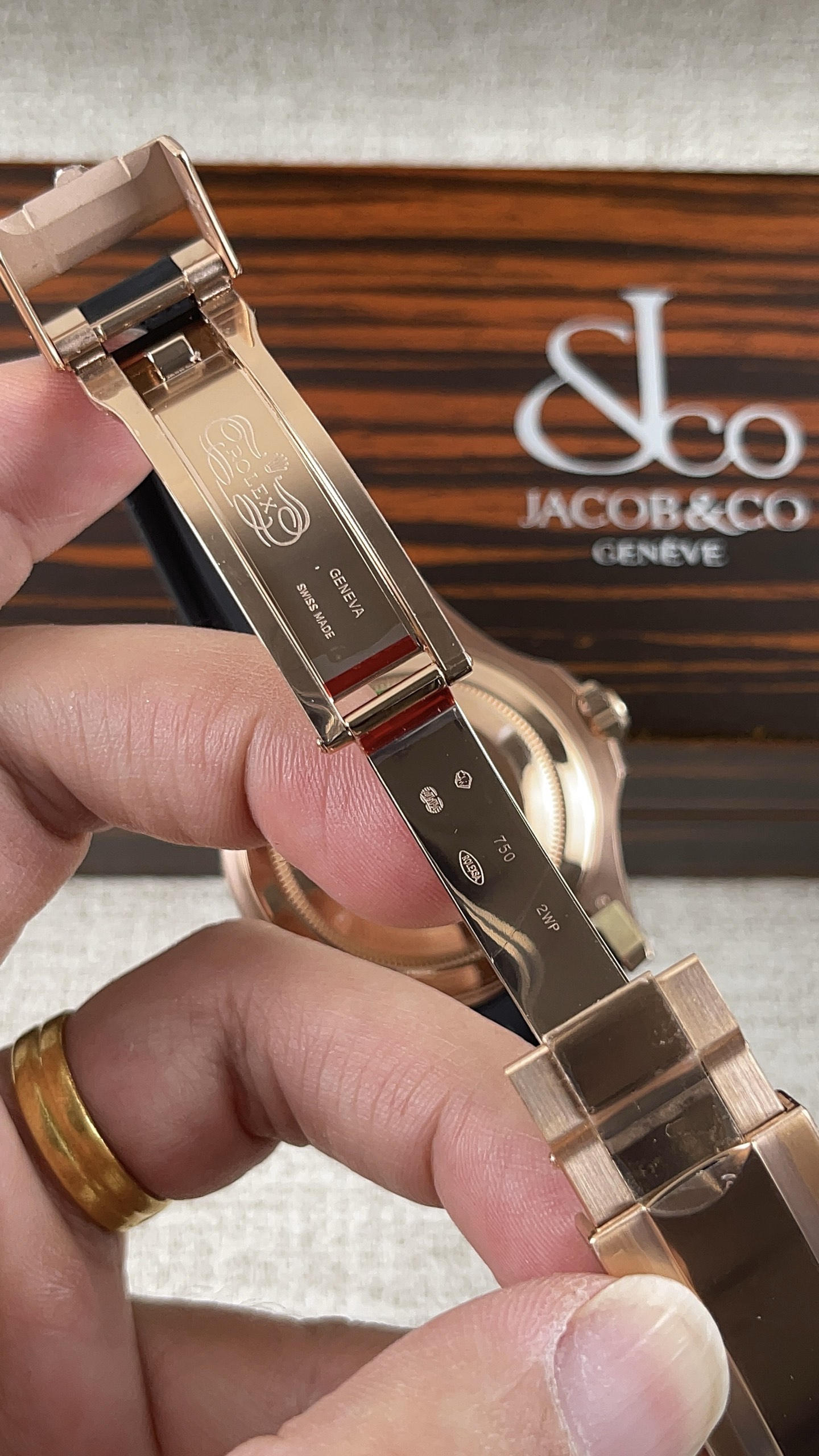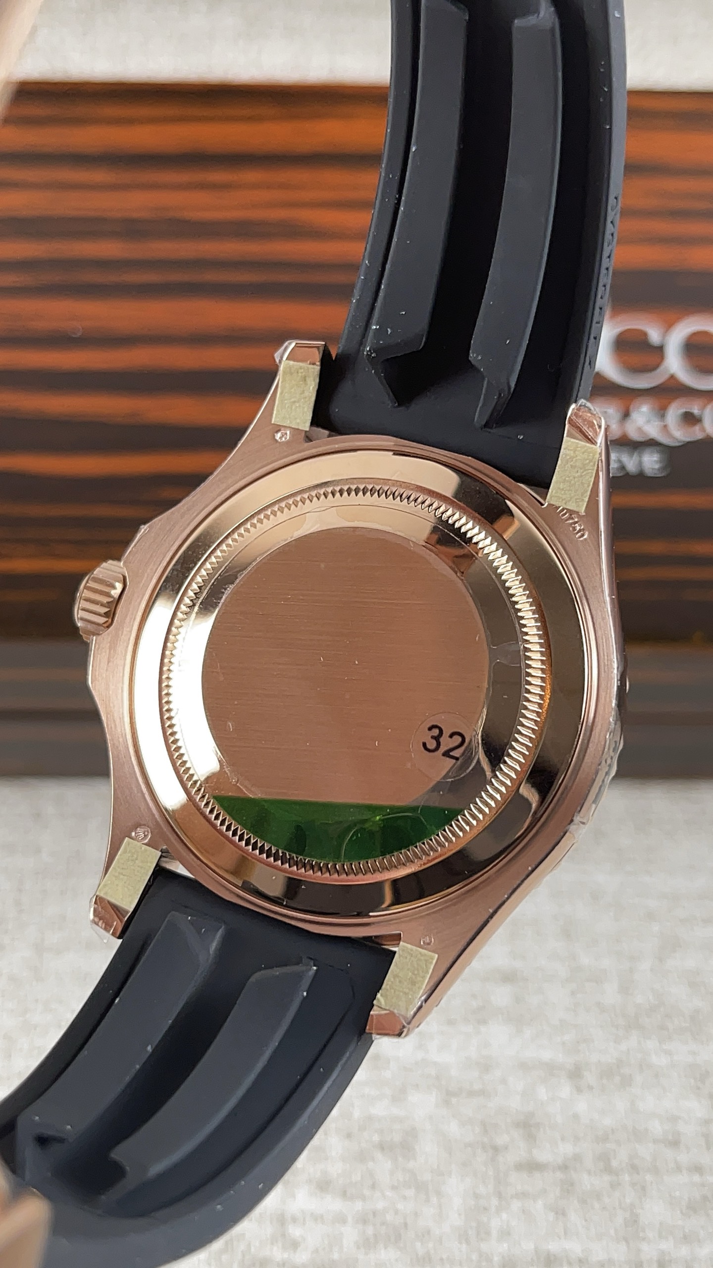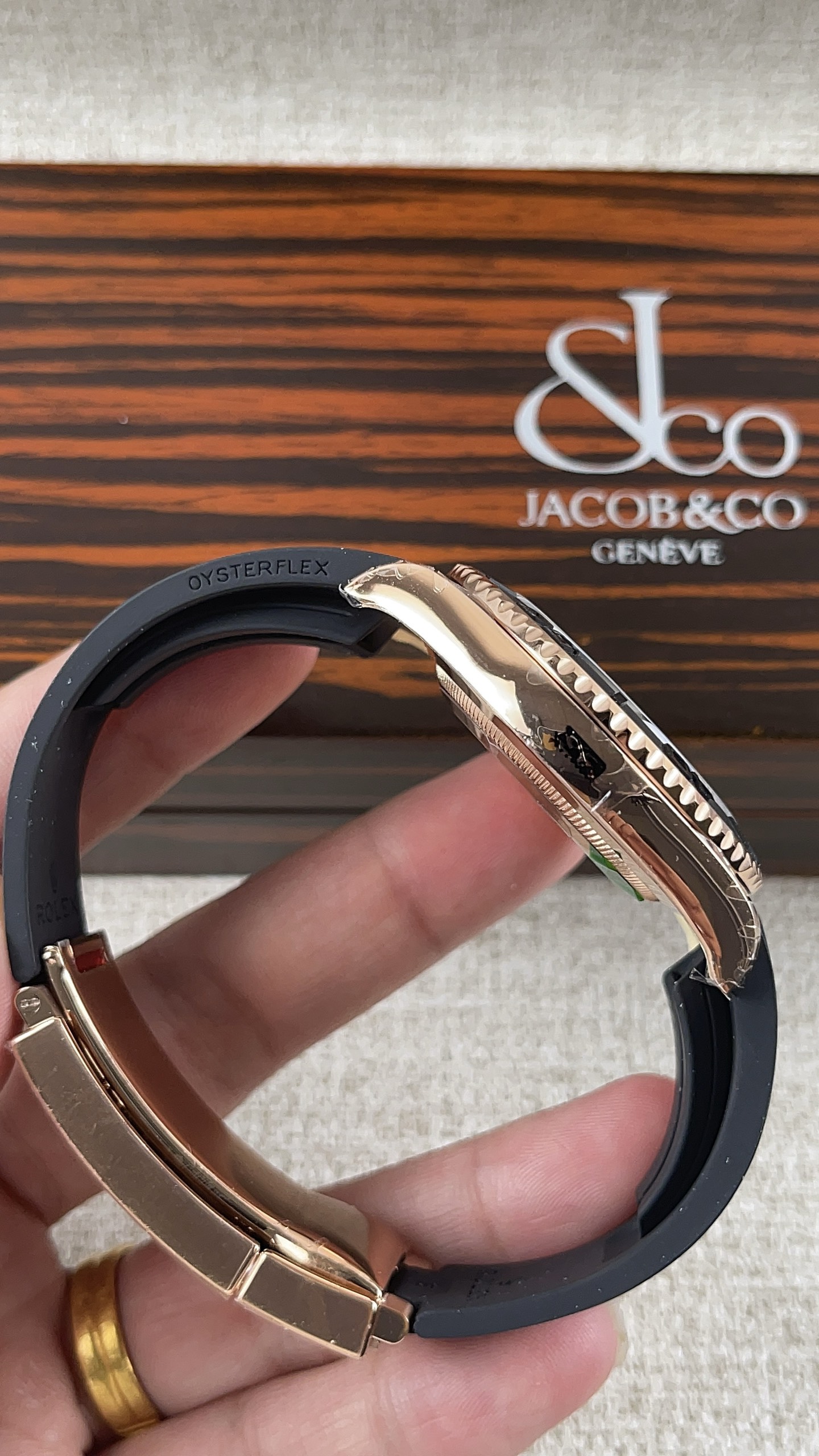 「エバーローズ」とステルスブラックの美学: ケース全体と重厚なオイスターロッククラスプには、豊かな18Kローズゴールドが厚くコーティングされています。VSFは、ロレックス純正のゴールドに正確に一致するように、この温かく銅色がかった「エバーローズ」の色合いを見事に完成させました。この裕福で温かみのある金属は、マットブラックのベゼル、文字盤、ラバーストラップに対して信じられないほど印象的でアグレッシブなコントラストを生み出します。