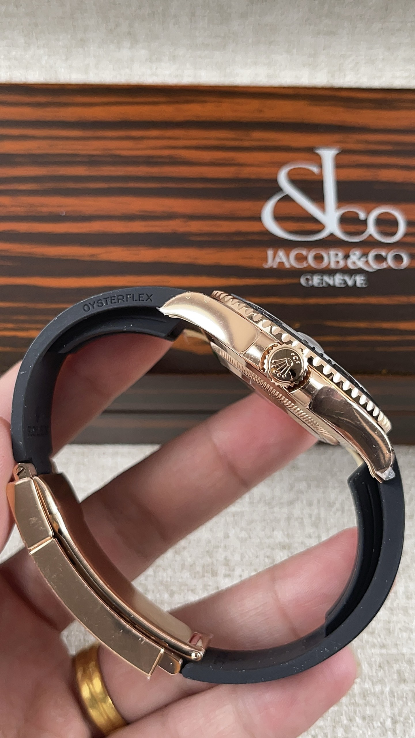 ストラップ: カスタム ブラック オイスターフレックス ブレスレット(高性能エラストマー)(18Kローズゴールドコーティング オイスターロック・セーフティクラスプ付き)