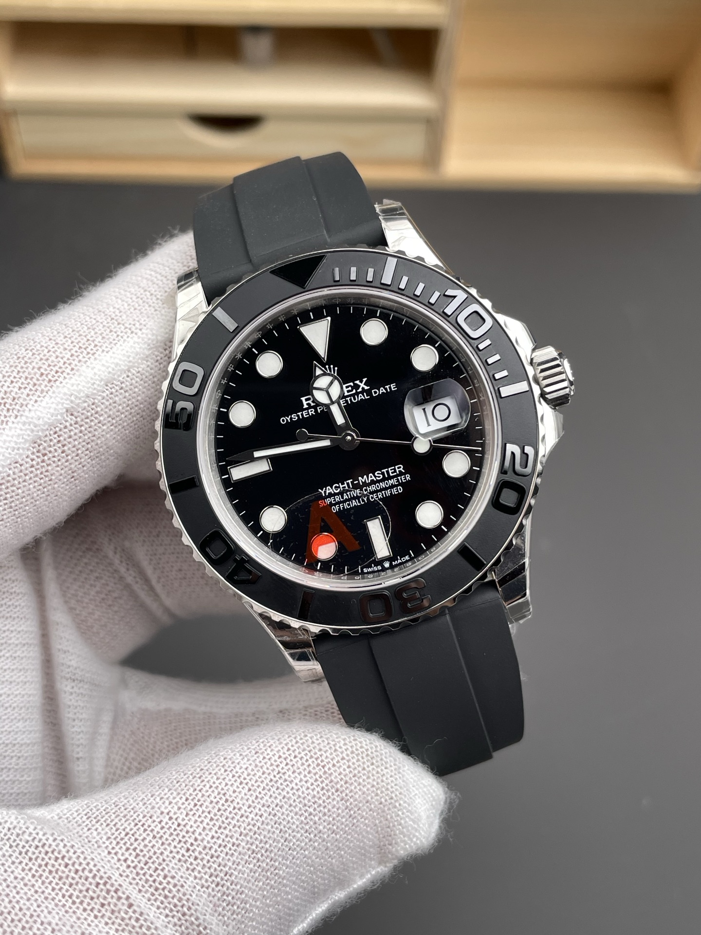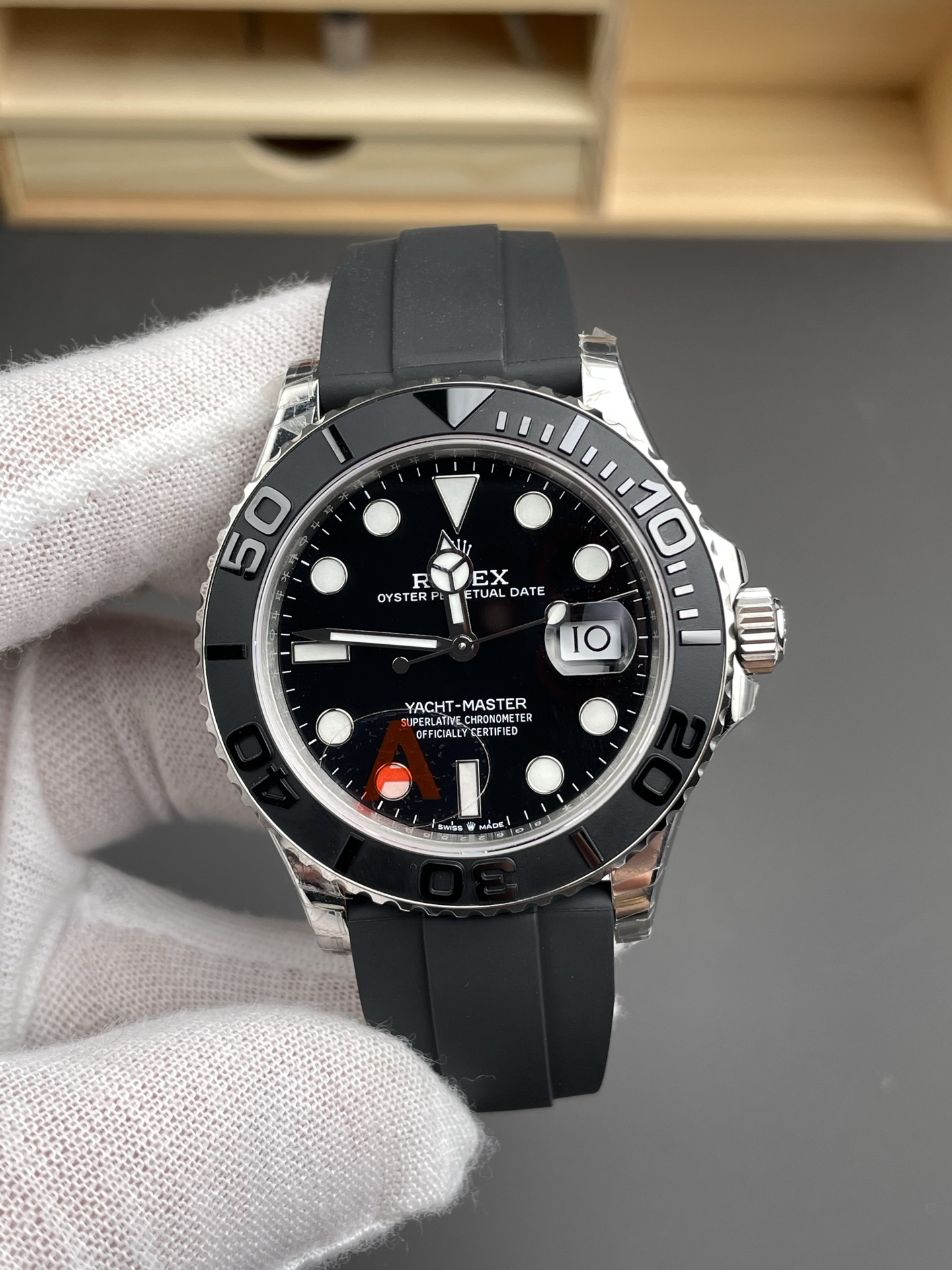 モノクローム マキシ文字盤: 文字盤は、最大限の視認性と洗練されたミニマリズムのために設計されています。フラットな黒の表面が光を吸収し、特大のアワーマーカー(プレミアムなブルーのクロマライトが充填されています)を鮮やかに際立たせます。ローズゴールドのバージョンとは異なり、「YACHT-MASTER」のテキストは鮮明な純白で印刷されており、超クリーンな「ステルス・ウェルス(控えめな富)」の美学を完成させています。
