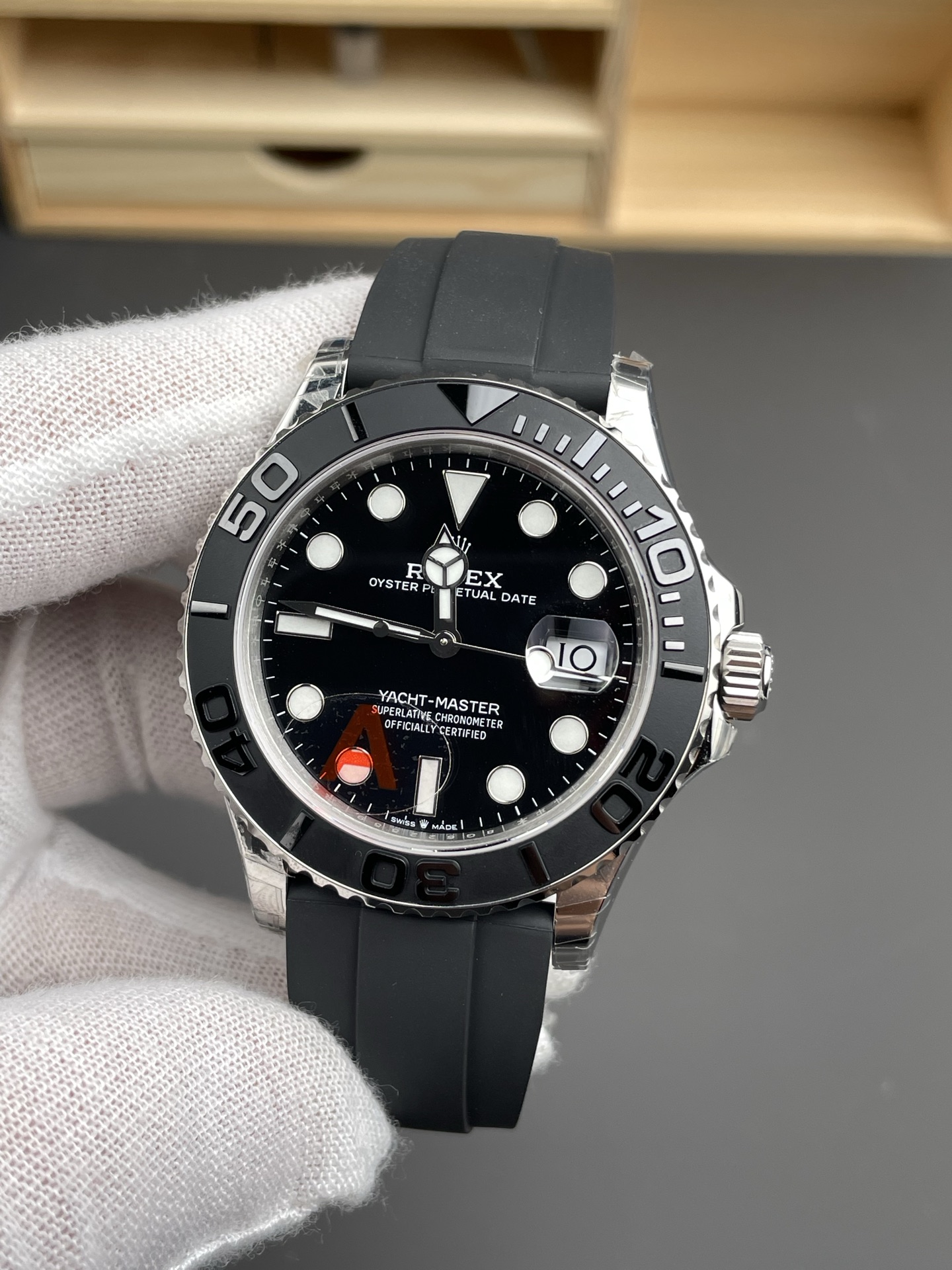 圧倒的な42mmの「ホワイトゴールド」の美学: ケース全体と重厚なオイスターロッククラスプは耐久性のある904Lオイスタースチールから鍛造されており、本物のソリッドホワイトゴールドのより重く、より温かみのある光沢を模倣するためにVSFによって巧みに研磨されています。より大きな42mmのケースプロファイルは、ヨットマスターが知られている流動的な人間工学を犠牲にすることなく、手首に信じられないほどアスレチックで実質的な感触を提供します。