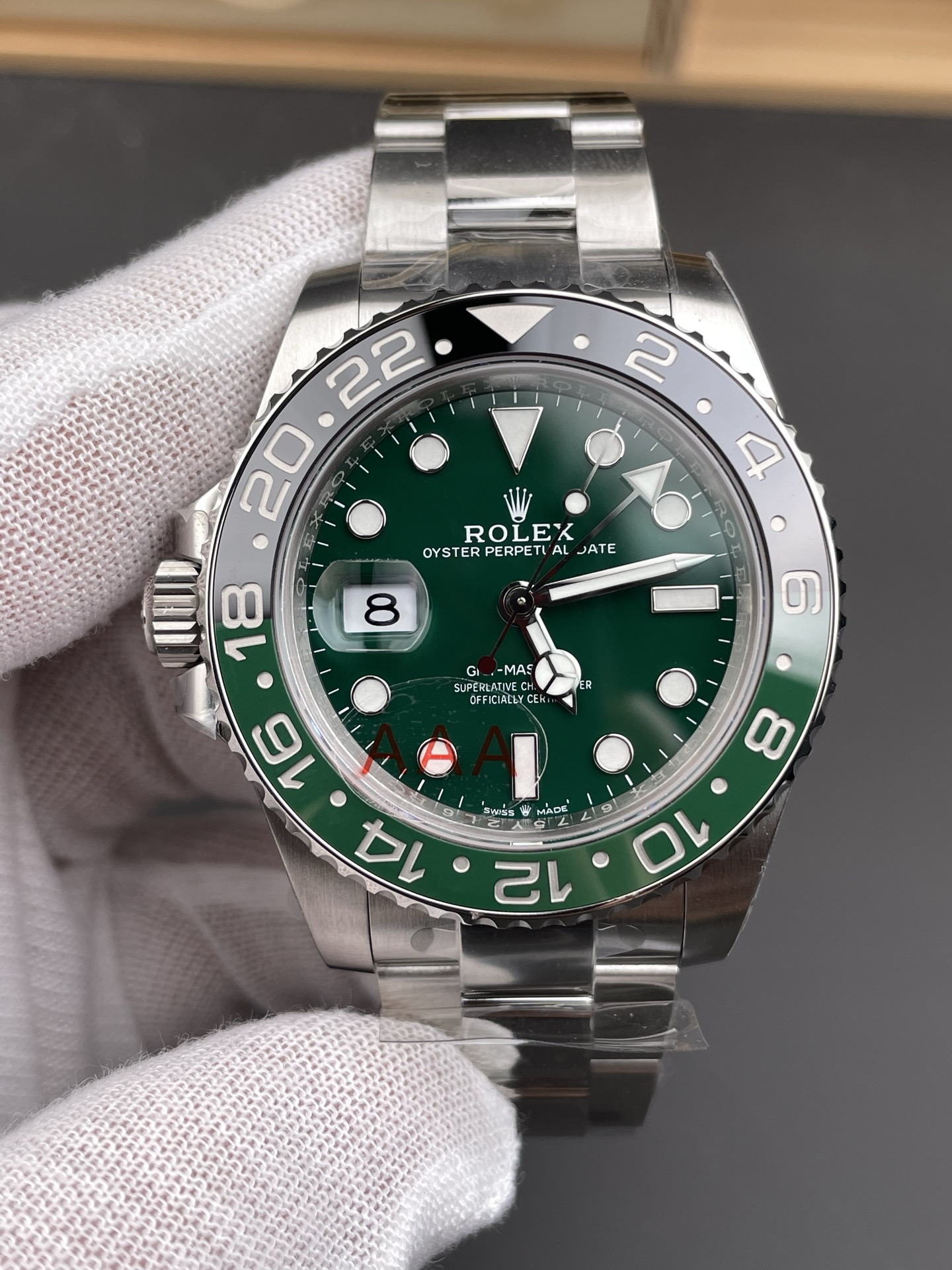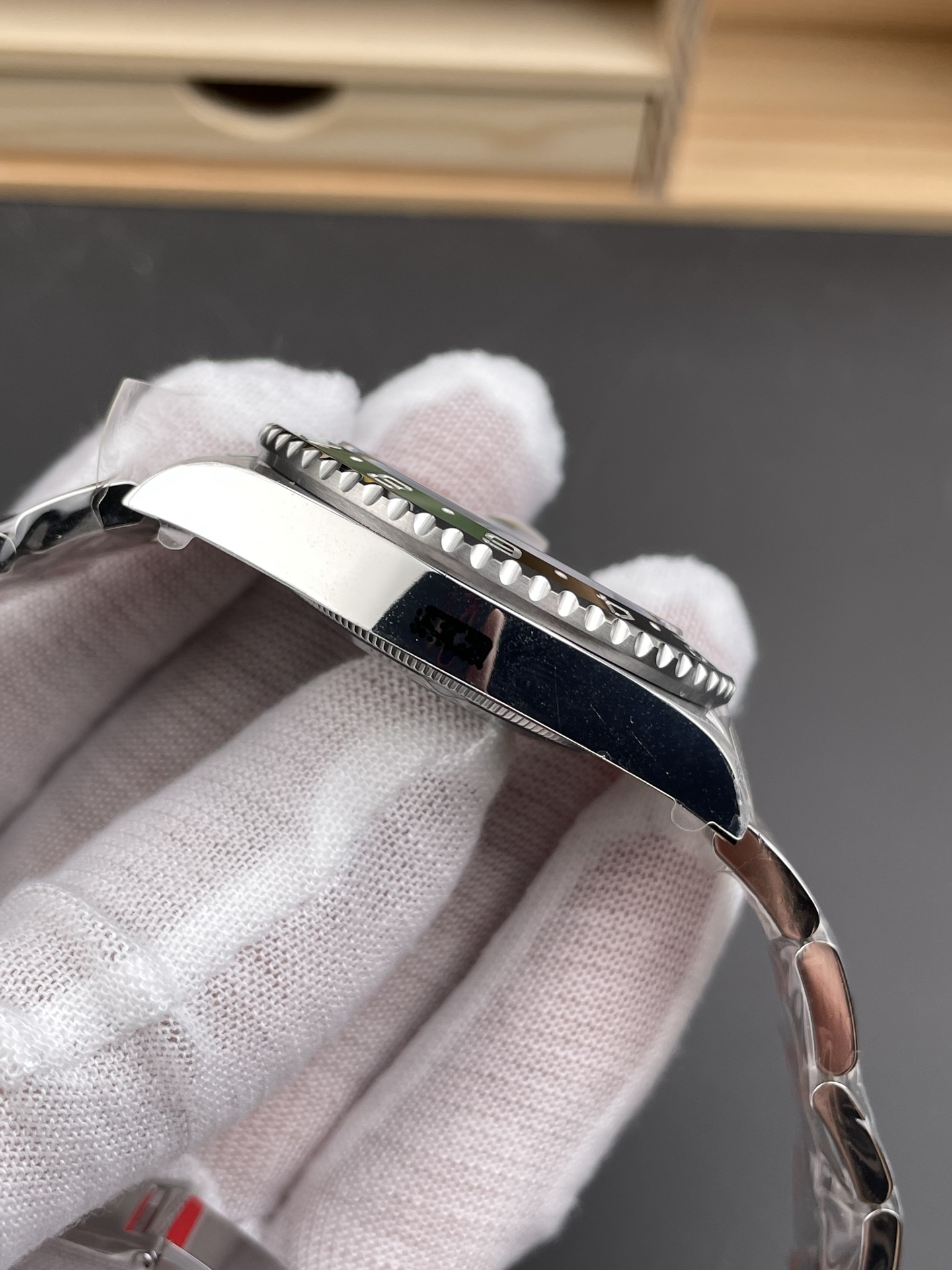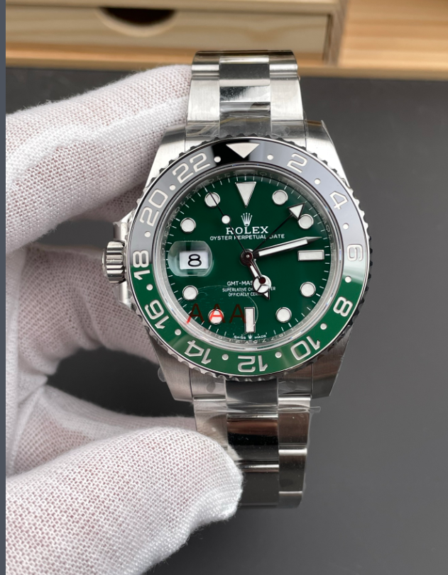 シームレスなモノブロックベゼルと精密加工: グリーンとブラックのセラミックベゼルインサートは、目に見える継ぎ目のない完璧な色の移行を実現しています。ベゼルの歯車溝はオリジナルの深さに合わせて精密に加工されており、実機同様の爪の感触を難なくパスします。
