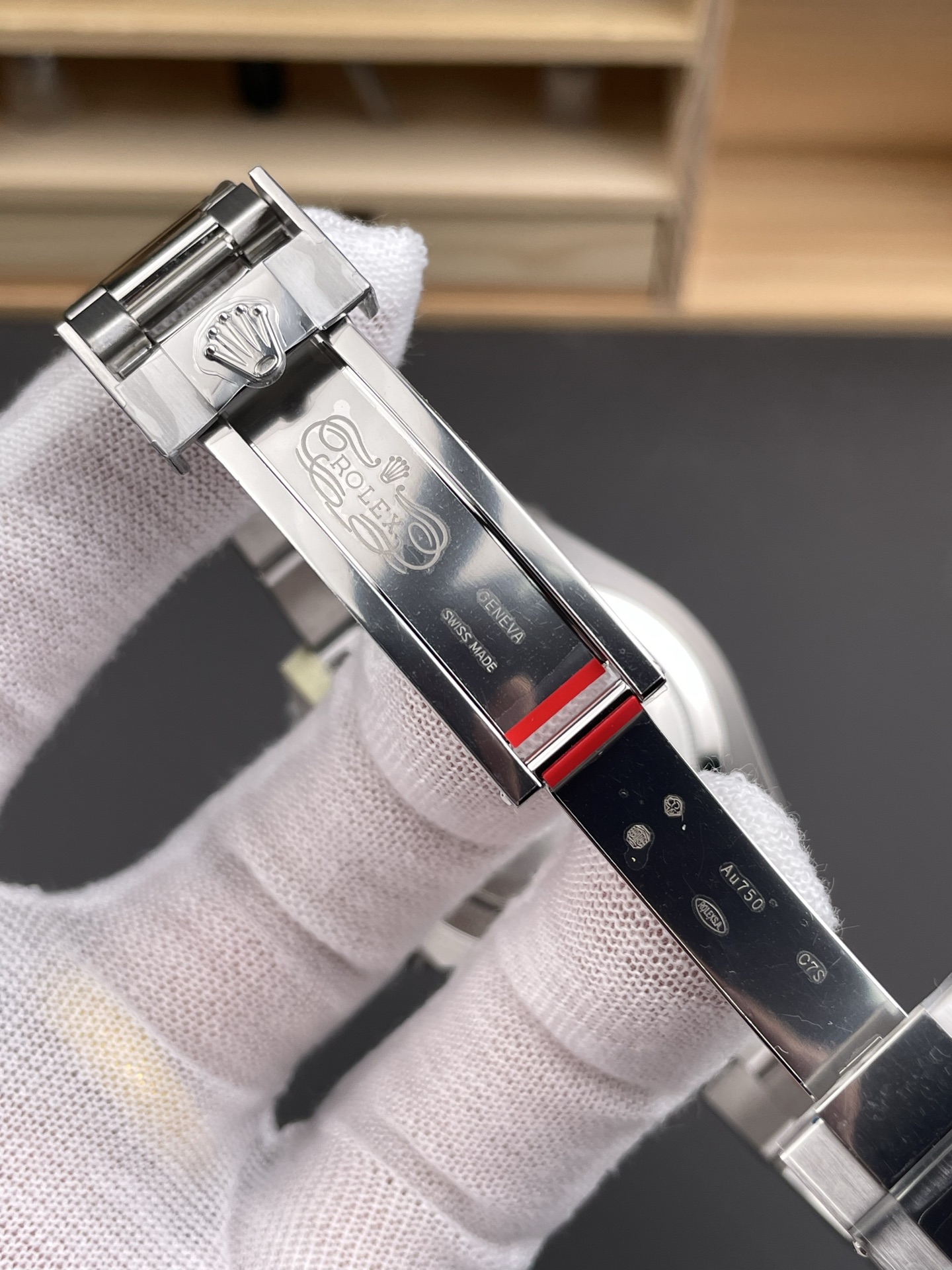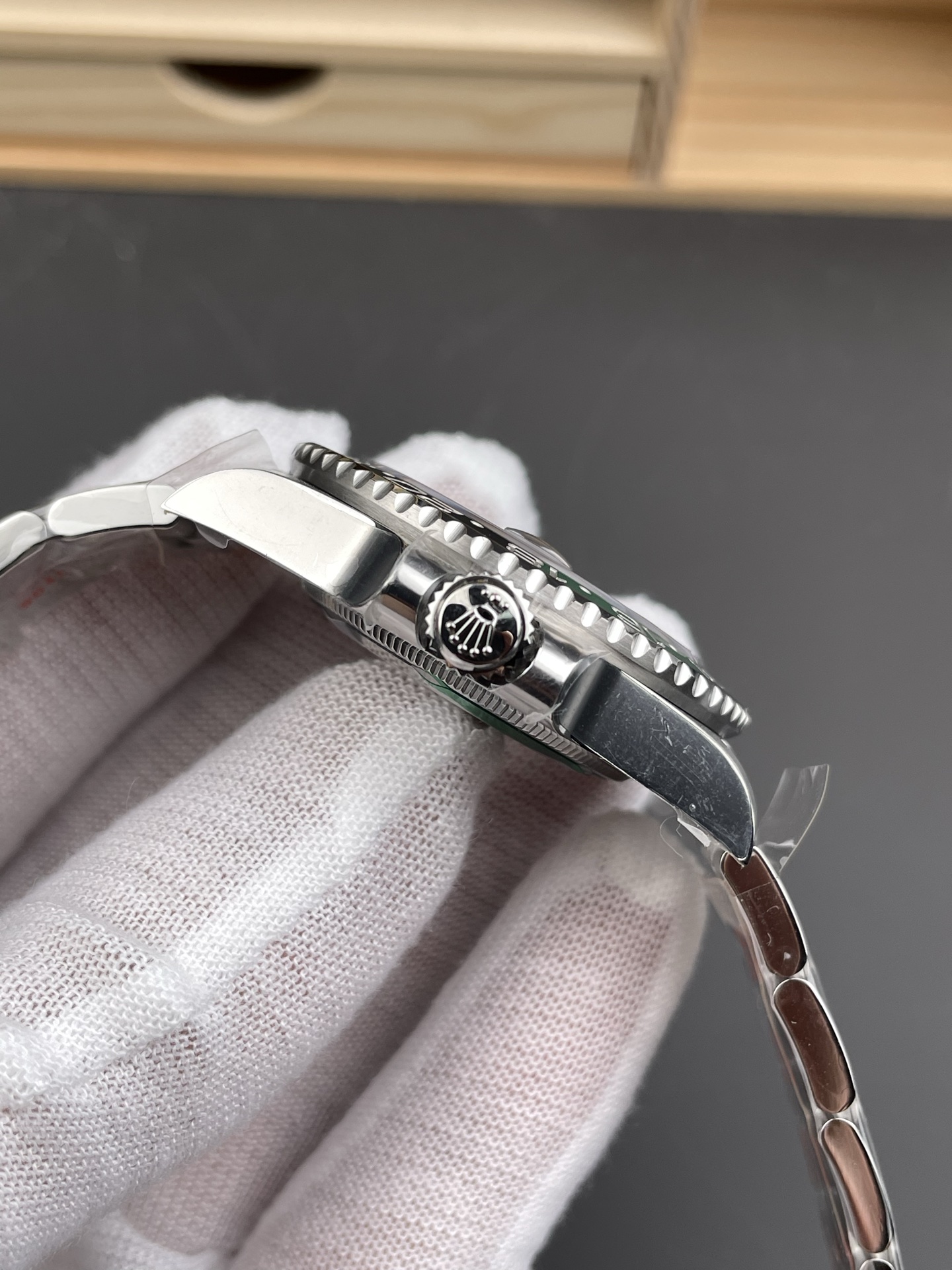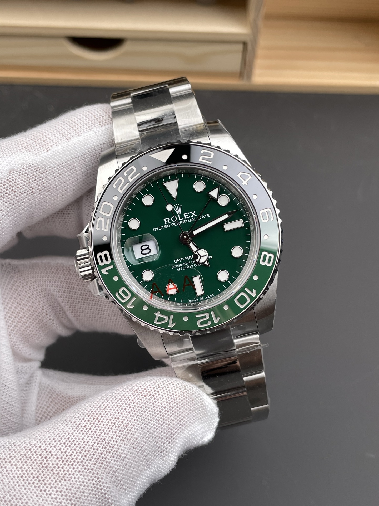 シームレスなモノブロックベゼルと精密加工: グリーンとブラックのセラミックベゼルインサートは、目に見える継ぎ目のない完璧な色の移行を実現しています。ベゼルの歯車溝はオリジナルの深さに合わせて精密に加工されており、実機同様の爪の感触を難なくパスします。