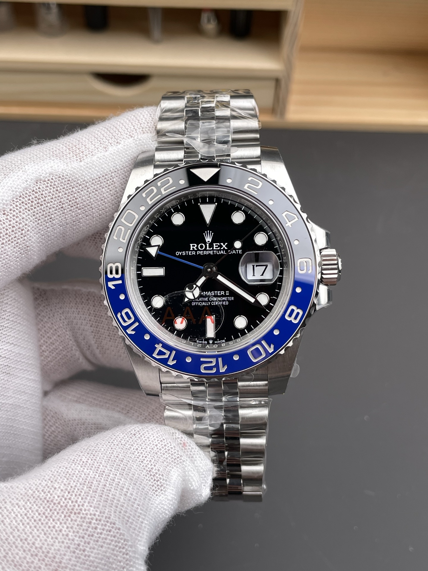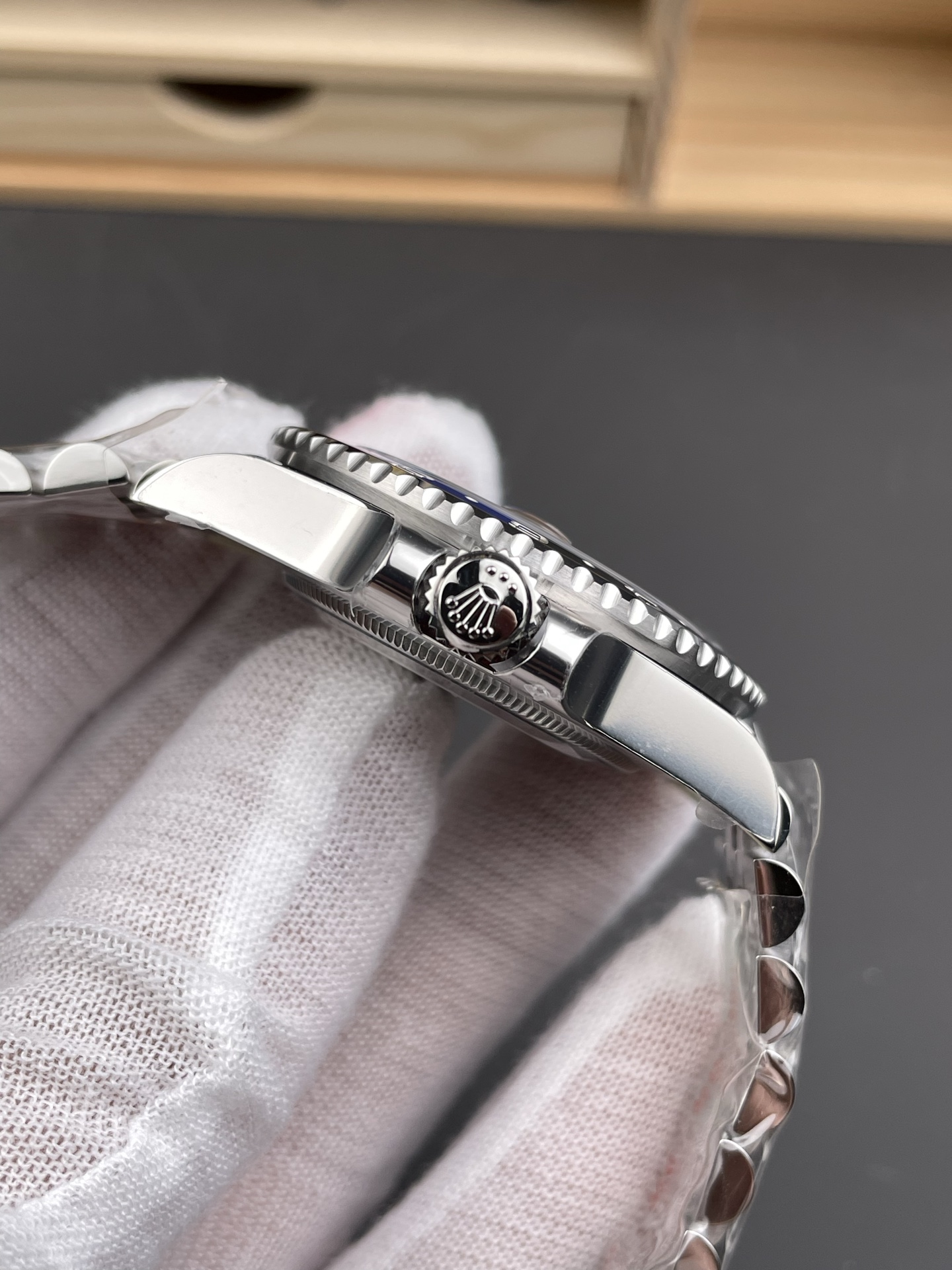 シームレスなベゼルの境目と精密加工: 特徴的なブルーとブラックのセラミックインサートは、低ランクの市場品に見られるような不自然な「スピードバンプ」の線のない、完璧な色の移行を実現しています。ベゼルの歯車溝はオリジナルの深さに合わせて精密に加工されており、実機同様の指先の感触を難なくパスします。