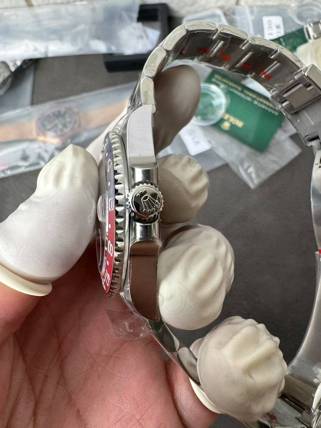 再現度の高い針(ハンド): 針は鋭く尖った分針の根元と、完全に平らでくっきりとしたセンター秒針で精密に作られており、一般的な市場品に見られる鈍い形や湾曲した形状を避けています。GMT針は正しい鮮やかな赤色のトーンを備えており、下位グレードのバージョンに見られる暗くくすんだ赤色を修正しています。