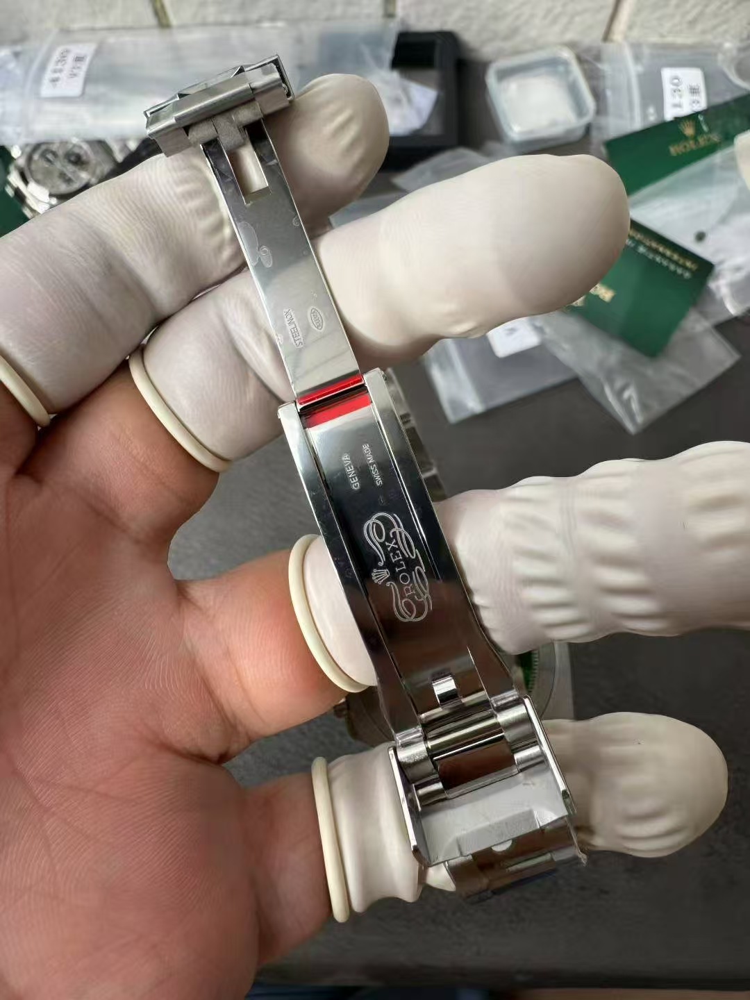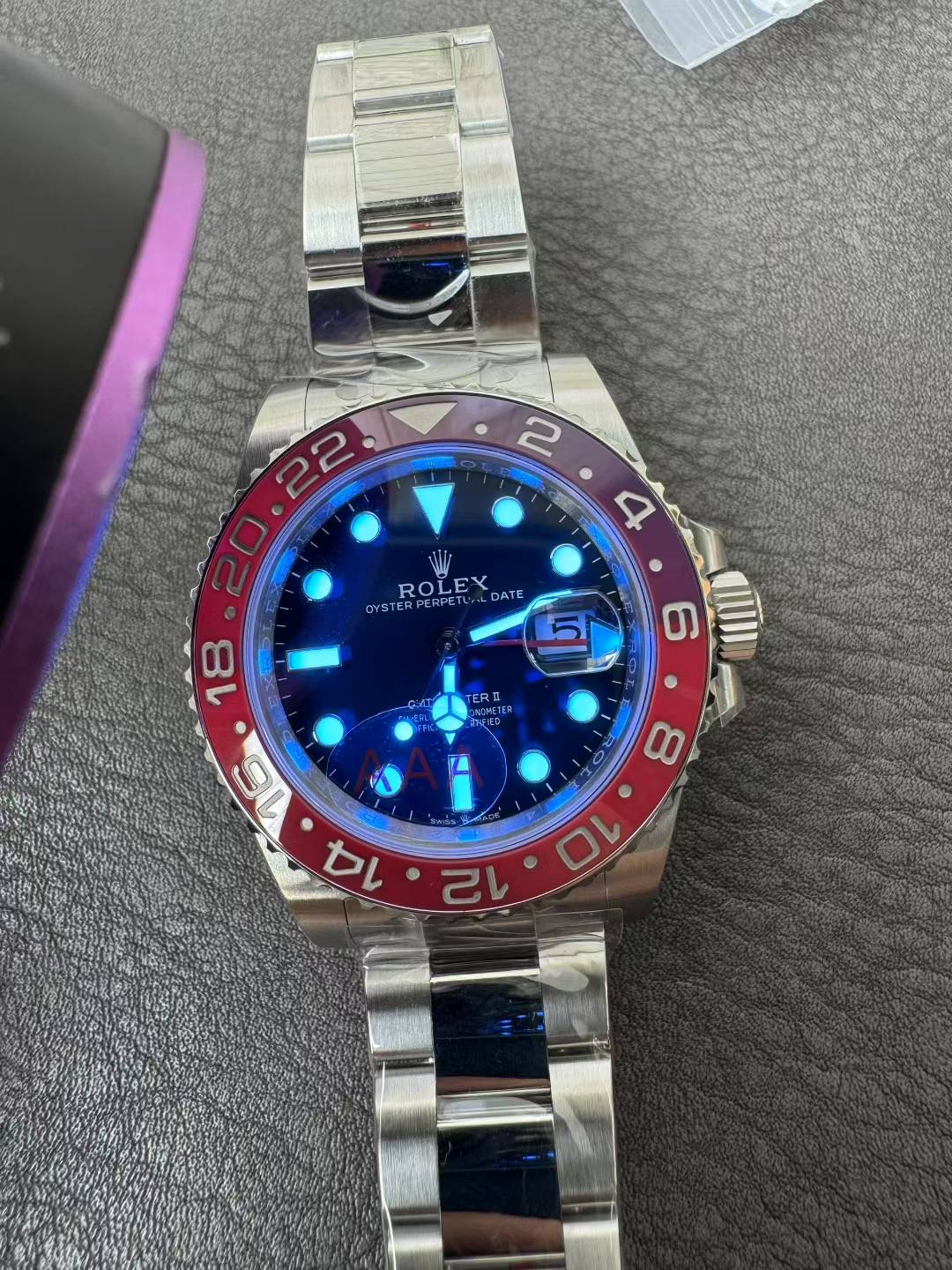 V3 UV反応型ベゼルと精密加工: 最新のV3レッド&ブルーセラミックインサートは驚くべきUV(紫外線)反応を示します。紫外線を当てるとベゼル全体が赤く発光し、正規品の素材特性を完璧に再現しています。さらに、ベゼルの歯車溝は完璧なサイズで作られており、他の市場バージョンによく見られるオーバーサイズで不正確な溝を修正しています。