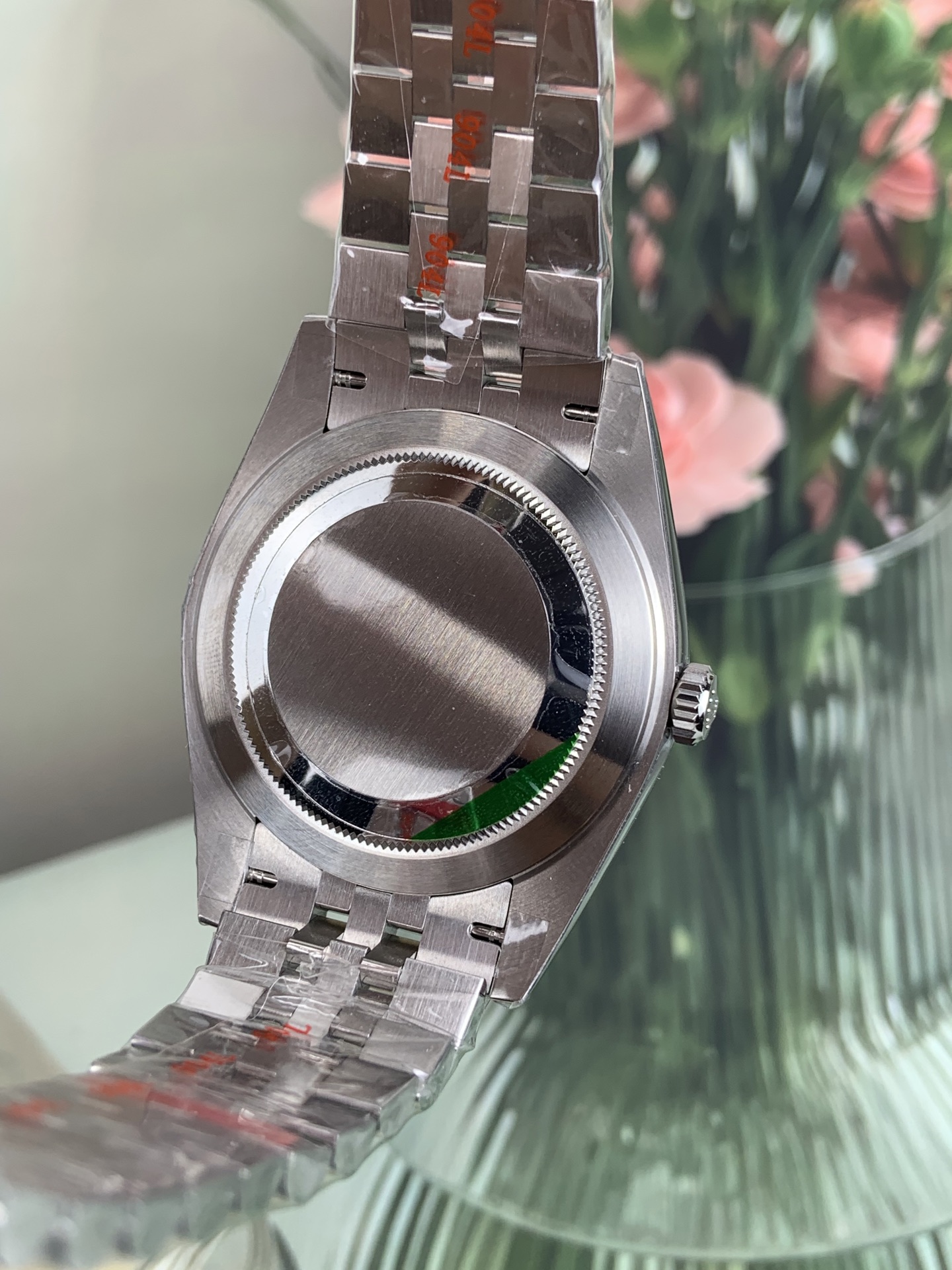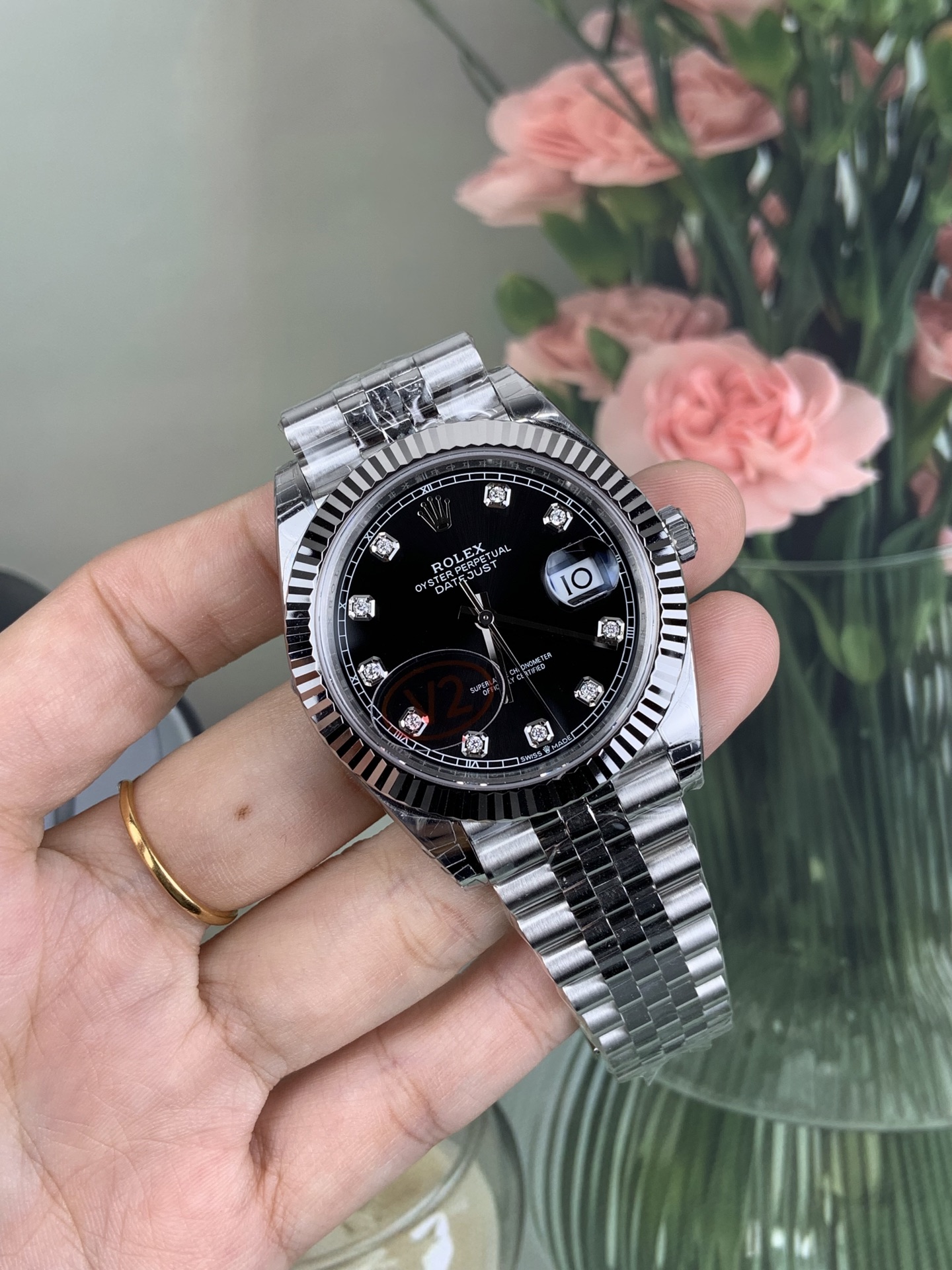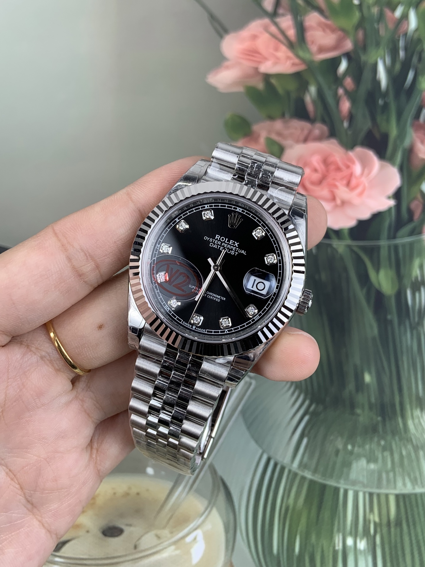 • ディープブラック ダイヤモンド文字盤: 文字盤は、洗練されたハイコントラストなラグジュアリーの絶対的な傑作です。深く豊かなブラックのフェイスは、輝く模造ダイヤモンドインデックスに完璧で際立った背景を提供します。それぞれのダイヤモンドは完璧にカットされ、研磨された金属の縁取りに緻密に手作業でセットされており、41mmのケースの暗いキャンバスに対して見事に際立つ信じられないほど裕福な輝きを提供します。