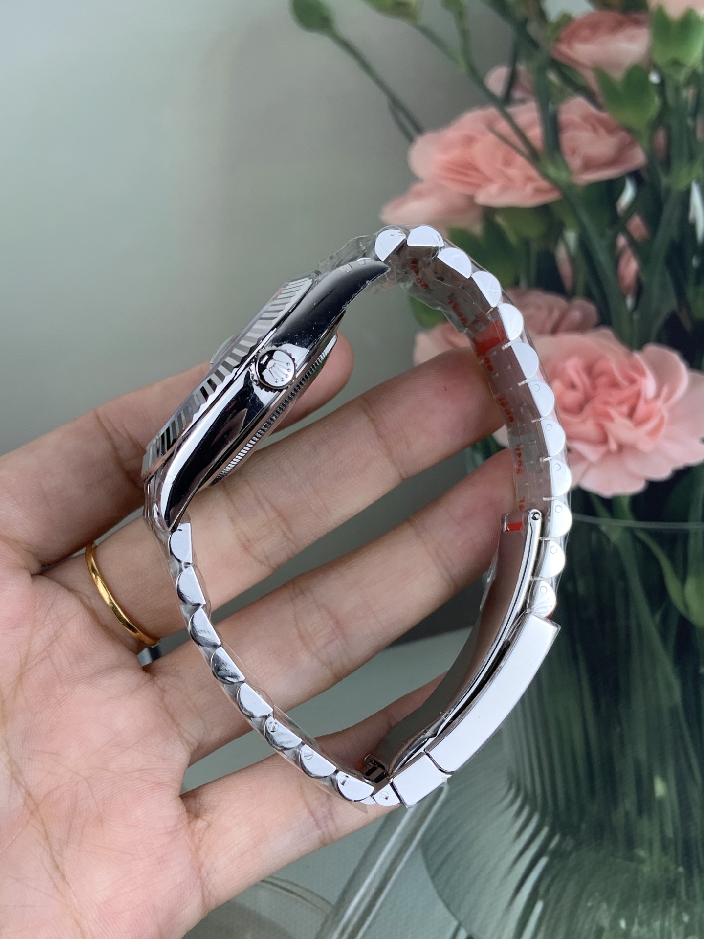 • ベゼル: 象徴的なフルーテッドベゼル(ホワイトゴールドを模倣するポリッシュ仕上げ 904Lスチール)