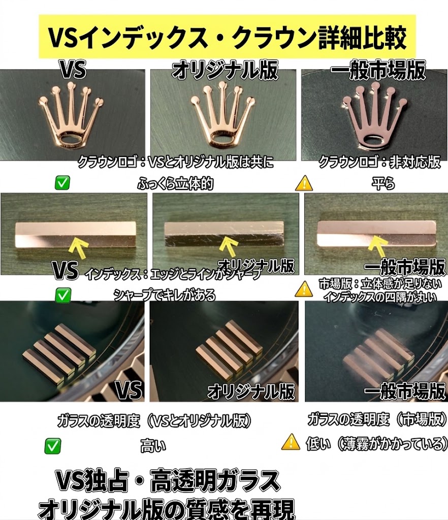 • リューズサイズの徹底: さらに驚くべきはリューズの厚みです。VSFは2.54mmと、ここでも純正と1:1の数値を叩き出しています(市場品は2.75mmと分厚い)。シャツの袖口にスッと収まる本物のシルエットを、重さを犠牲にすることなく実現したのです。