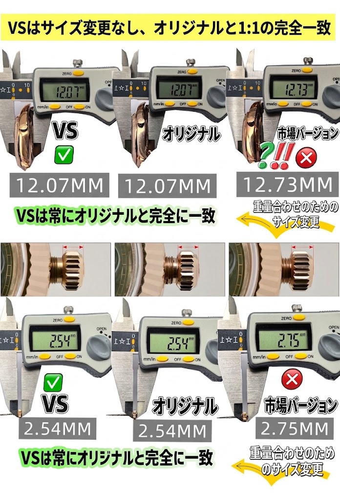 • ケース厚の完全一致(12.07mm): 純正デイデイトのケース厚は12.07mmです。画像をご覧の通り、VSFの182g重量版もノギス実測でピッタリ12.07mmを計測しています。一方、市場の安価な重量版は、重りを入れる空間を作るために12.73mmまで肥大化しており、ドレスウォッチとしての優雅なプロポーションを完全に崩してしまっています。