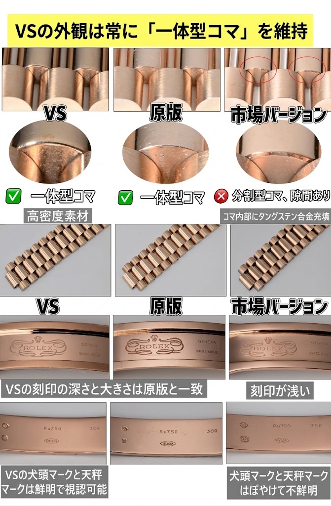 (画像説明:VSFのシームレスな一体型コマ構造と、深くシャープに刻まれた貴金属ホールマークの比較。市場品との差は歴然です。)